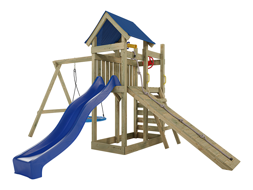 Spielturm Hefty KDI inkl. Doppelschaukel inkl. Rutsche blau + Nestschaukel