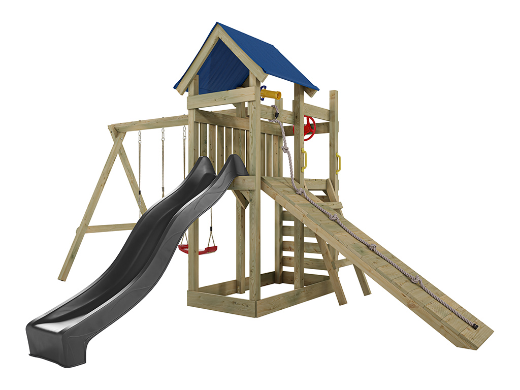- Inklusive Rutsche in Grau mit 9 x 9 cm starkem Schaukelbalken.