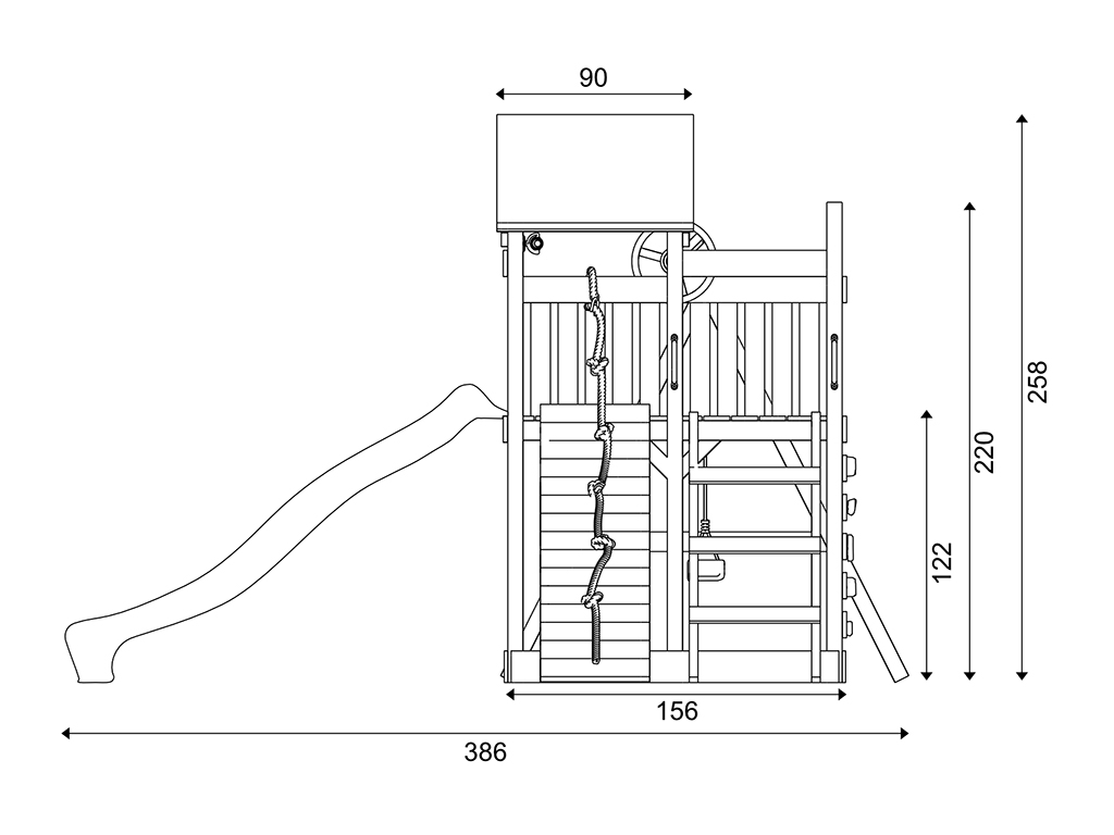 Dieser Spielturm bietet deinem Kind einzigartige Erlebnisse mit viel Bewegung und Abenteuer – ein wahrer Spieltraum! Das Außenmaß dieses Spielturms beträgt 481 x 486 cm. Die Firsthöhe liegt bei 258 cm.