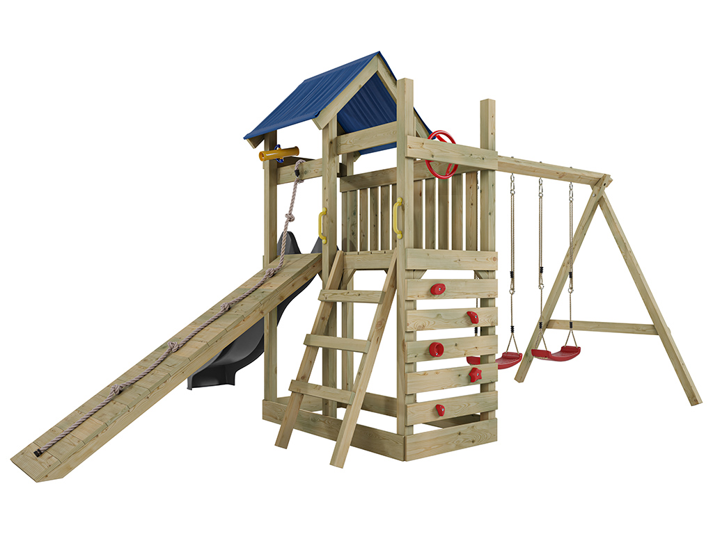 - Inklusive Rutsche in Grau mit 9 x 9 cm starkem Schaukelbalken.