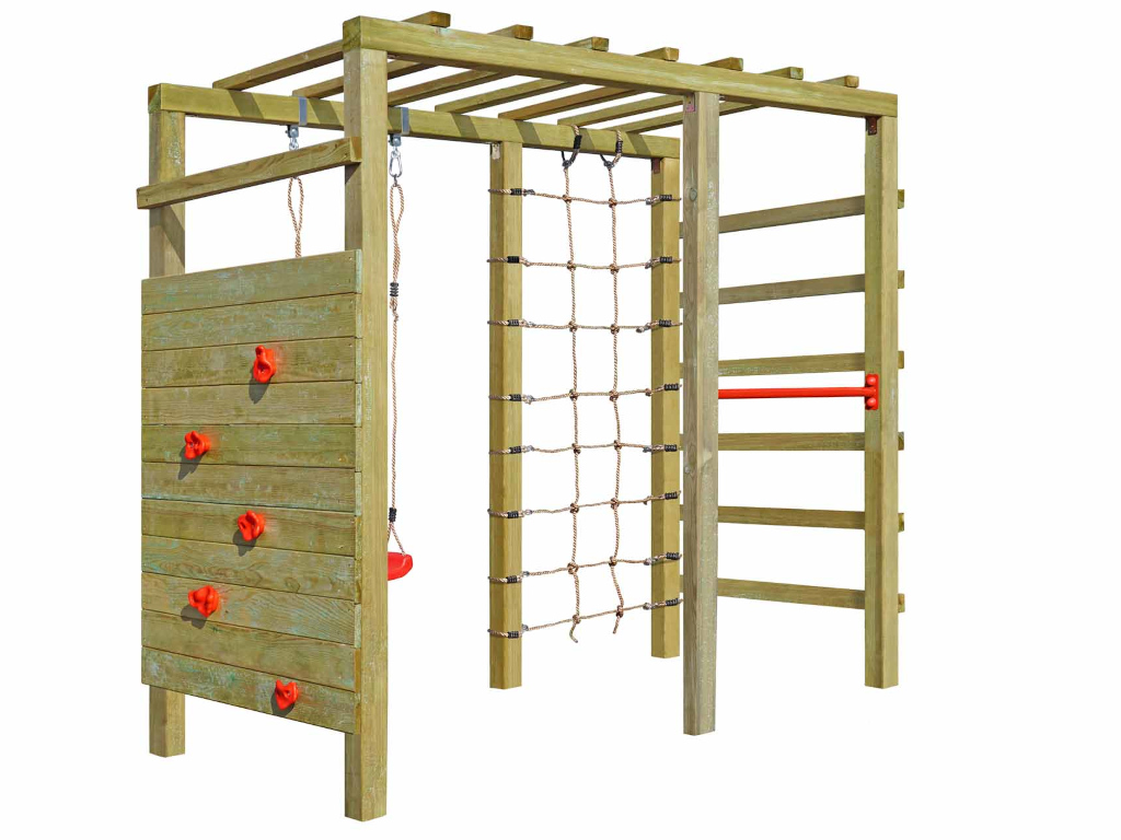 | Lieferumfang: | Klettergerüst Hango Rex, Kletterwand, 5x Klettersteine rot, kleines Kletternetz, 1x Schaukelsitz rot, Reckstange rot |