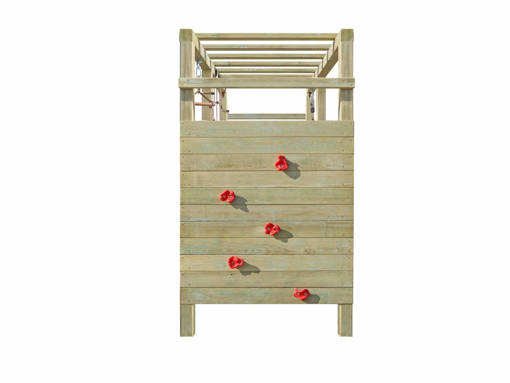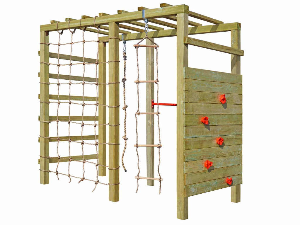 Material: Holz, B x T x H: 240 x 120 x 219 cm, inkl. Kletterwand + Kletternetz, inkl. Kontenseil + Strickleiter + Reckstange