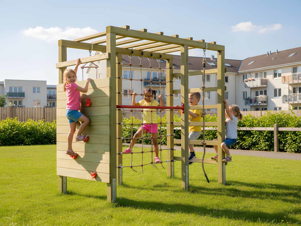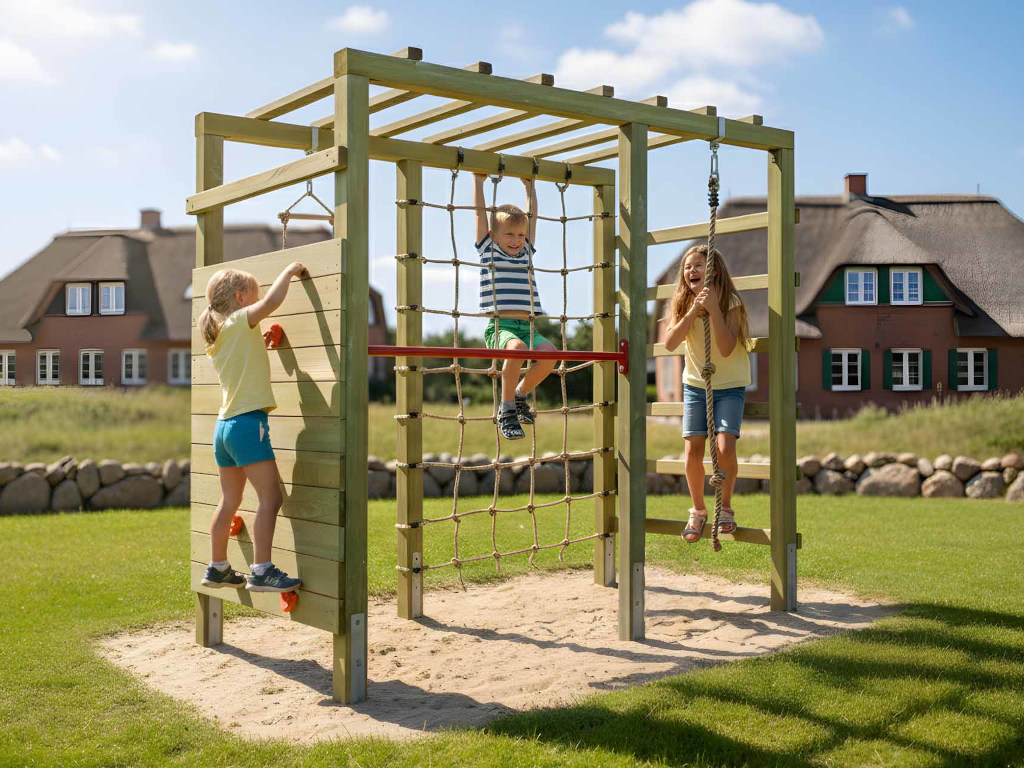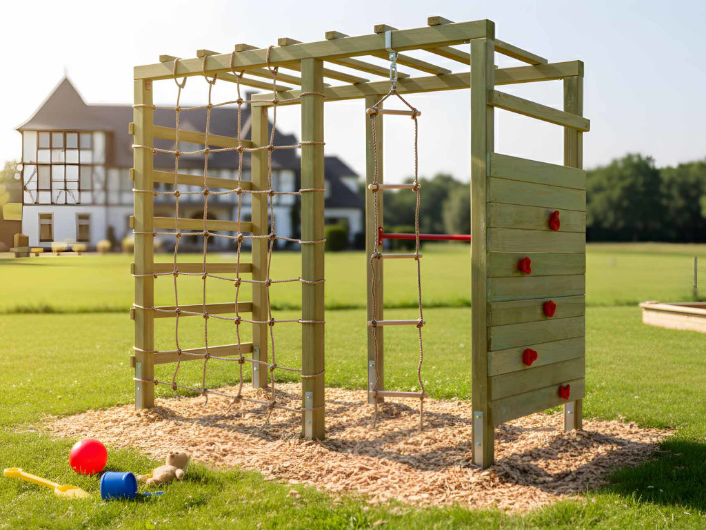 Material: Holz, B x T x H: 240 x 120 x 219 cm, inkl. Kletterwand + Kletternetz, inkl. Kontenseil + Strickleiter + Reckstange