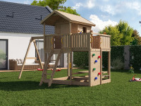 Dieser Spielturm kombiniert Spielturm mit Spielhaus. Der Spielturm verfügt über zwei Podeste, die über eine Leiter auf der einen und eine Kletterwand mit Klettersteinen auf der anderen Seite erklommen werden können. Auf dem Podest befindet sich ein überdachtes Spielhaus mit zwei Eingängen und einem Fensterausschnitt. - Inkl. Rutsche