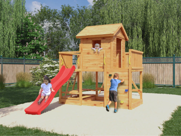 Dieser Spielturm kombiniert Spielturm mit Spielhaus. Der Spielturm verfügt über zwei Podeste, die über eine Leiter auf der einen und eine Kletterwand mit Klettersteinen auf der anderen Seite erklommen werden können. Auf dem Podest befindet sich ein überdachtes Spielhaus mit zwei Eingängen und einem Fensterausschnitt. - Inkl. Rutsche
