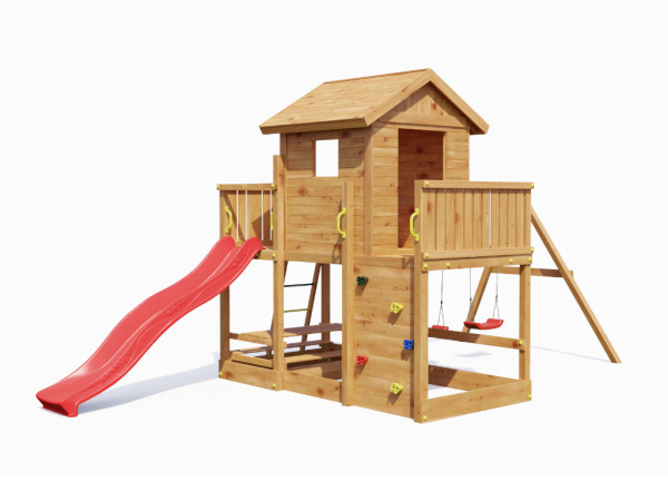 | Lieferumfang: | Spielturm Mars mit Spielhaus, Kletterwand + 5x Klettersteine, Leiter, Doppelschaukel, 2 Schaukelsitze rot, Picknick-Tisch, 6x Haltegriffe, 6x Bodenanker, Sandkasten unter Spielturm, Rutsche |