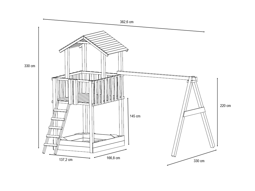 | Außenmaß: | B x T: 382,6 x 330 cm (inkl. Schaukel + Überstände) |