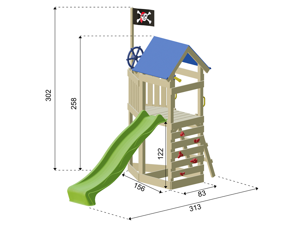 Für kleine Entdecker und große Piraten bietet dir der Spielturm eine Captain Jolly Flagge. Dieser Name ist das berühmte Symbol für alle Piraten. Aus der Ferne erkennbar und der Traum eines jeden Piraten unter einem zu segeln. Das große Schiff mit seinen 313 x 156 x 250 cm, bietet ein Dach, um vor der rauen See zu schützen und unbekannte Inseln auch bei Stürmen zu finden. Die Aussichtsplattform wurde dafür auf 122 cm Höhe angesetzt. Um sich schnell ins Abenteuer zu stürzen findet sich eine blaue Rutsche am Backbord (links). Doch um wieder schnell in See zu stechen ist eine Kletterwand am Heck des Schiffes oder eine Leiter an der Steuerbord Seite.
