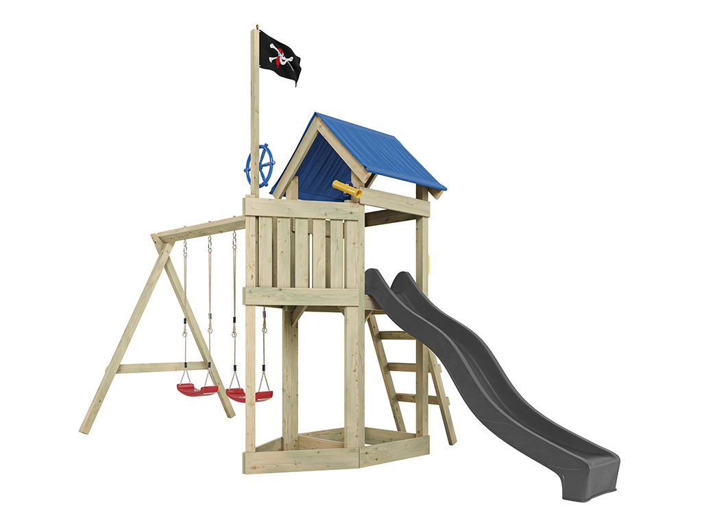 Outgarden Spielturm Pirat Captain Jolly KDI mit Doppelschaukel inkl. Rutsche grau + Sitze rot