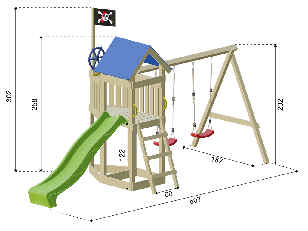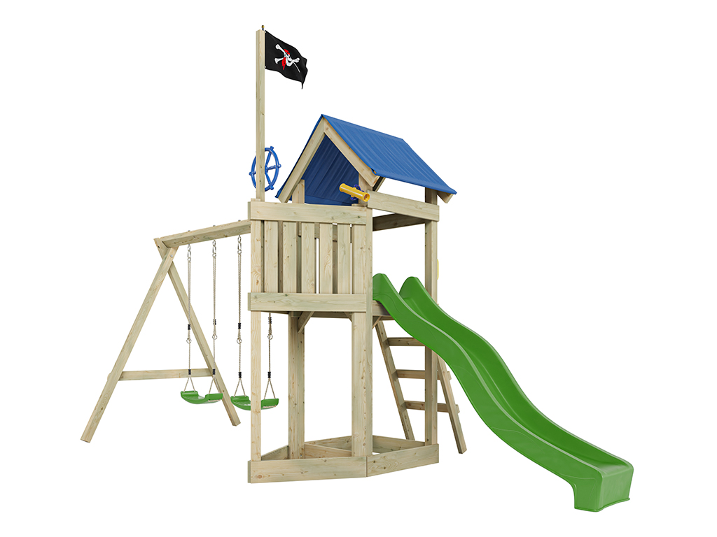 Für kleine Entdecker und große Piraten bietet dir der Spielturm eine Captain Jolly Flagge. Dieser Name ist das berühmte Symbol für alle Piraten. Aus der Ferne erkennbar und der Traum eines jeden Piraten unter einem zu segeln. Das große Schiff mit seinen 507 x 205 x 258 cm, bietet ein Dach, um vor der rauen See zu schützen und unbekannte Inseln auch bei Stürmen zu finden. Die Aussichtsplattform wurde dafür auf 122 cm Höhe angesetzt. Um sich schnell ins Abenteuer zu stürzen findet sich eine blaue Rutsche am Backbord (links). Doch um wieder schnell in See zu stechen ist eine Kletterwand am Heck des Schiffes oder eine Leiter an der Steuerbord Seite. Sollten andere Piraten auf hoher See auftauchen, ist das Schiff mit einer Doppelschaukel ausgerüstet, um schnell auf das andere Schiff zu belangen.