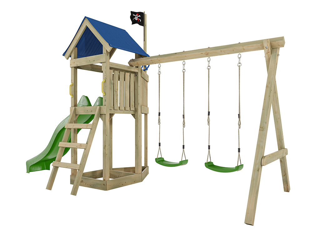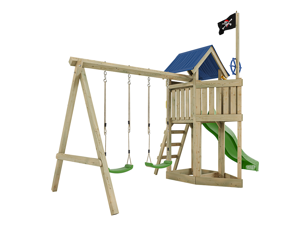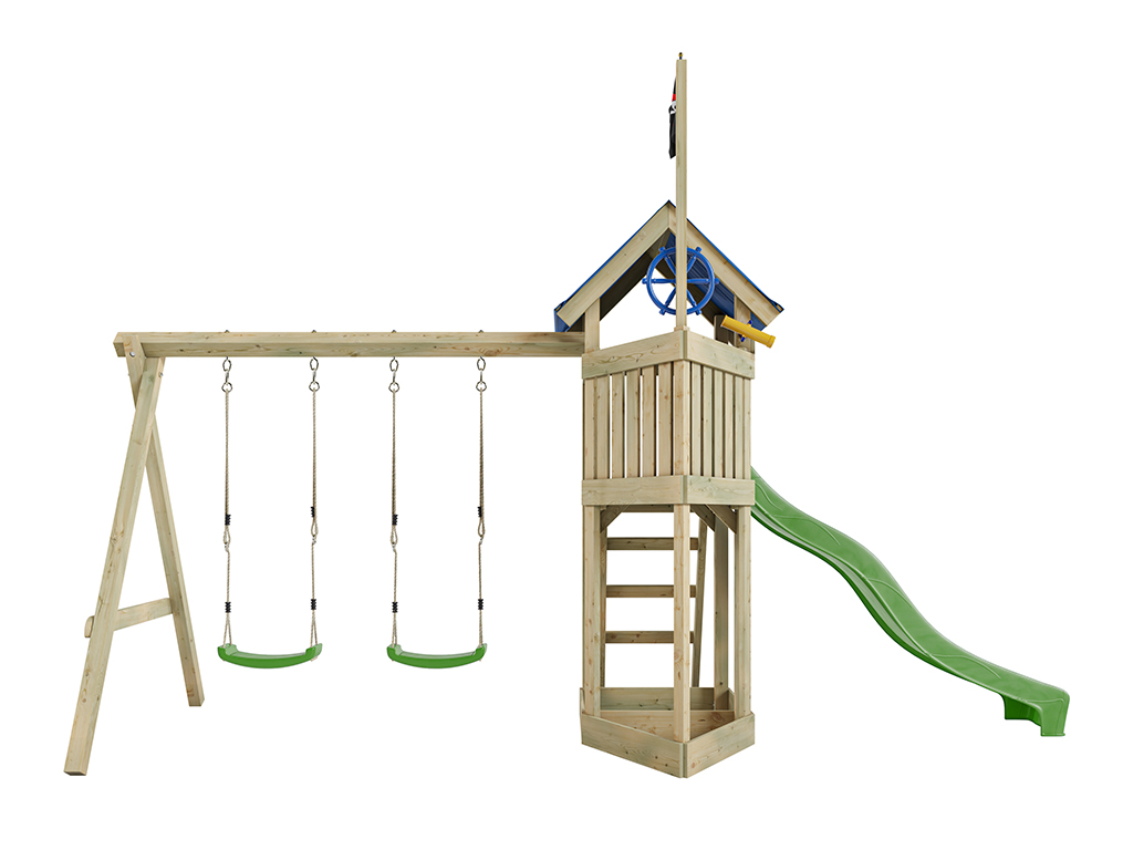 Spielturm Pirat Captain Jolly KDI mit Doppelschaukel inkl. Rutsche grün + Sitze grün