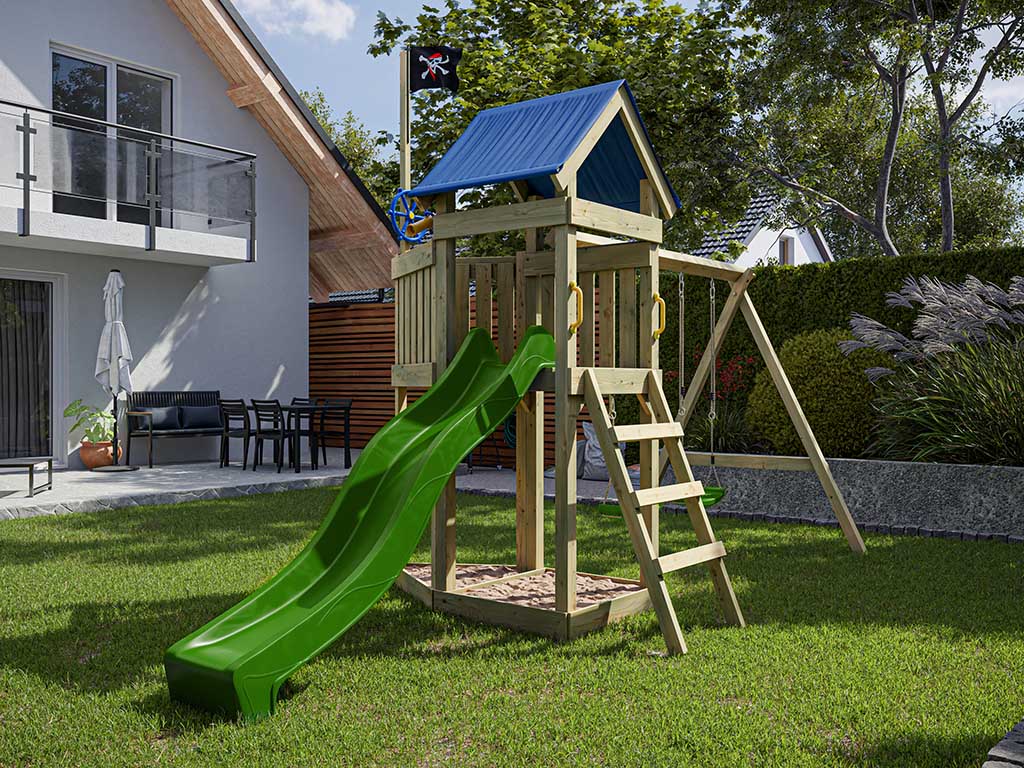 Spielturm Pirat Captain Jolly KDI mit Doppelschaukel inkl. Rutsche grün + Sitze grün