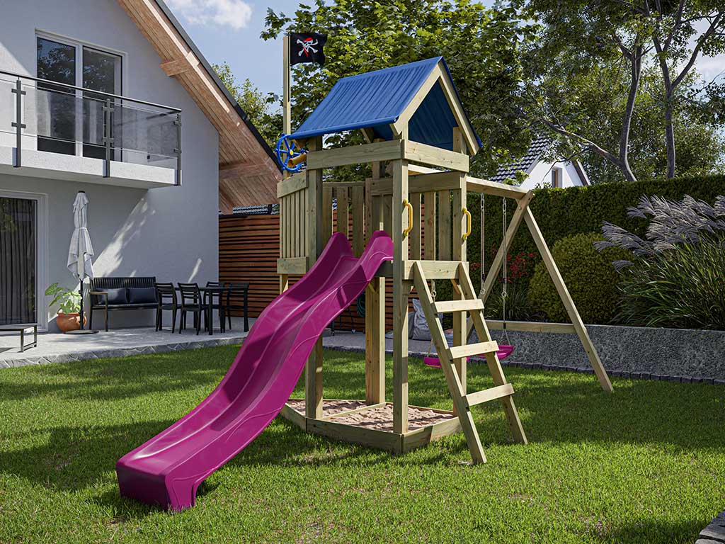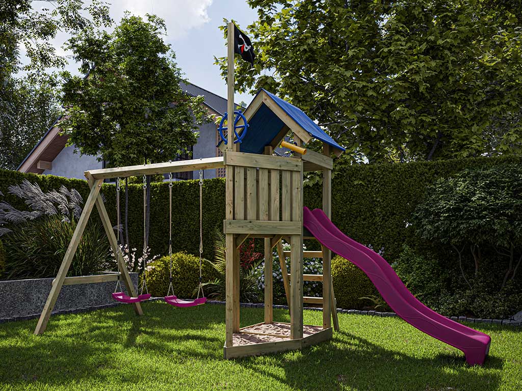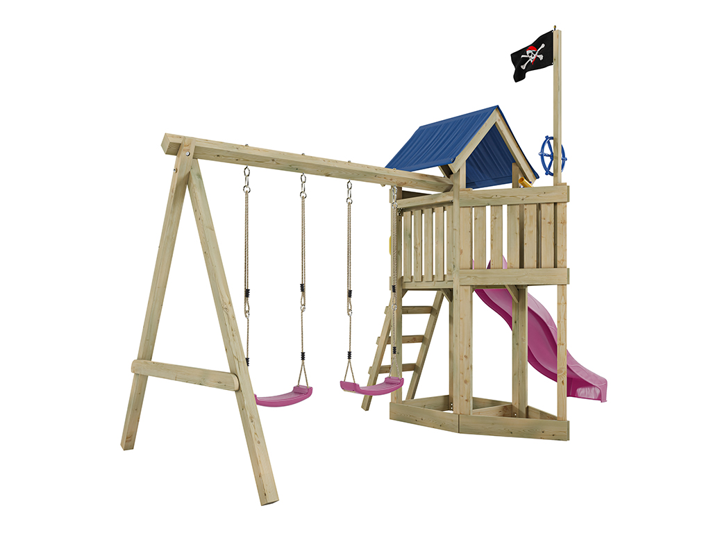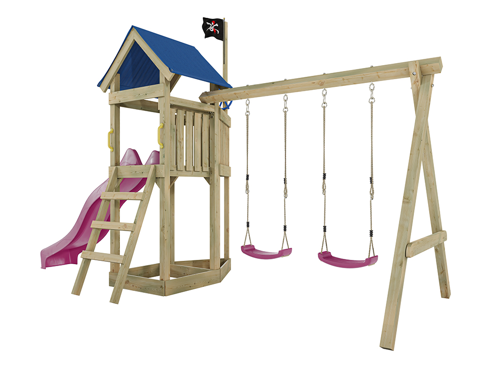 Spielturm Pirat Captain Jolly KDI mit Doppelschaukel inkl. Rutsche pink + Sitze pink