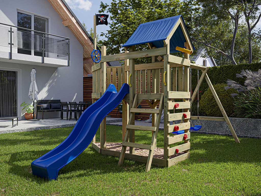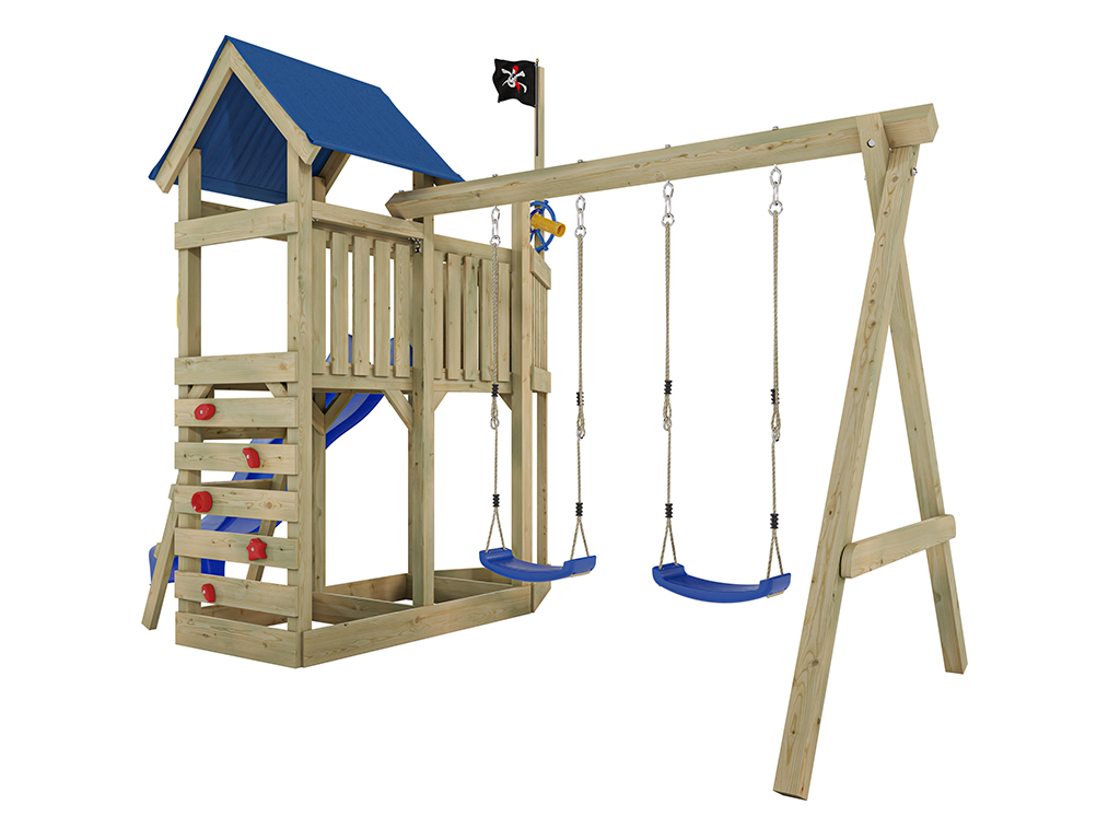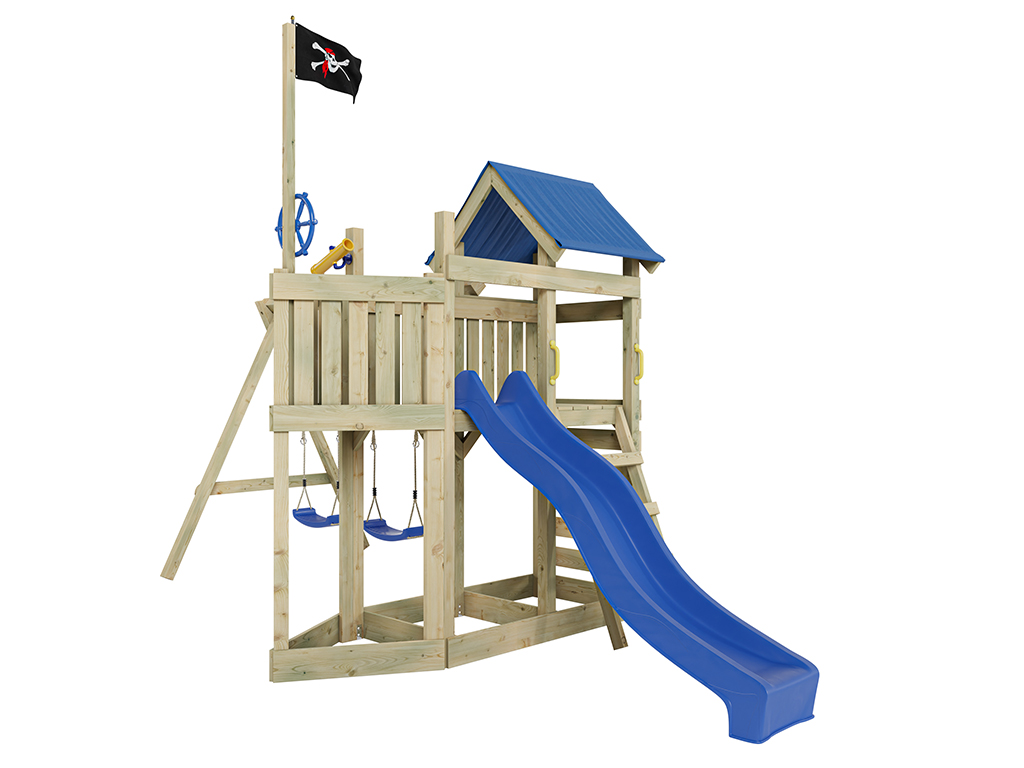 Spielturm Pirat Captain Snappy KDI mit Doppelschaukel inkl. Rutsche blau + Sitze blau