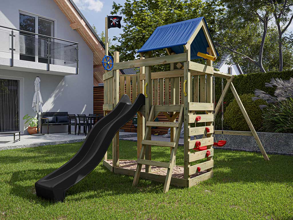 Für kleine Entdecker und große Piraten bietet dir der Spielturm eine Captain-Jolly-Flagge. Dieser Name ist das berühmte Symbol für alle Piraten. Aus der Ferne erkennbar und der Traum eines jeden Piraten, unter einem zu segeln. Das große Schiff mit seinen 507 x 255 x 258 cm bietet ein Dach, um vor der rauen See zu schützen und unbekannte Inseln auch bei Stürmen zu finden. Die Aussichtsplattform wurde dafür auf 122 cm Höhe angesetzt. Um sich schnell ins Abenteuer zu stürzen, findet sich eine blaue Rutsche an Backbord (links). Doch um wieder schnell in See zu stechen, ist eine Kletterwand am Heck des Schiffes oder eine Leiter an der Steuerbordseite. Sollten andere Piraten auf hoher See auftauchen, ist das Schiff mit einer Doppelschaukel ausgerüstet, um schnell auf das andere Schiff zu gelangen.