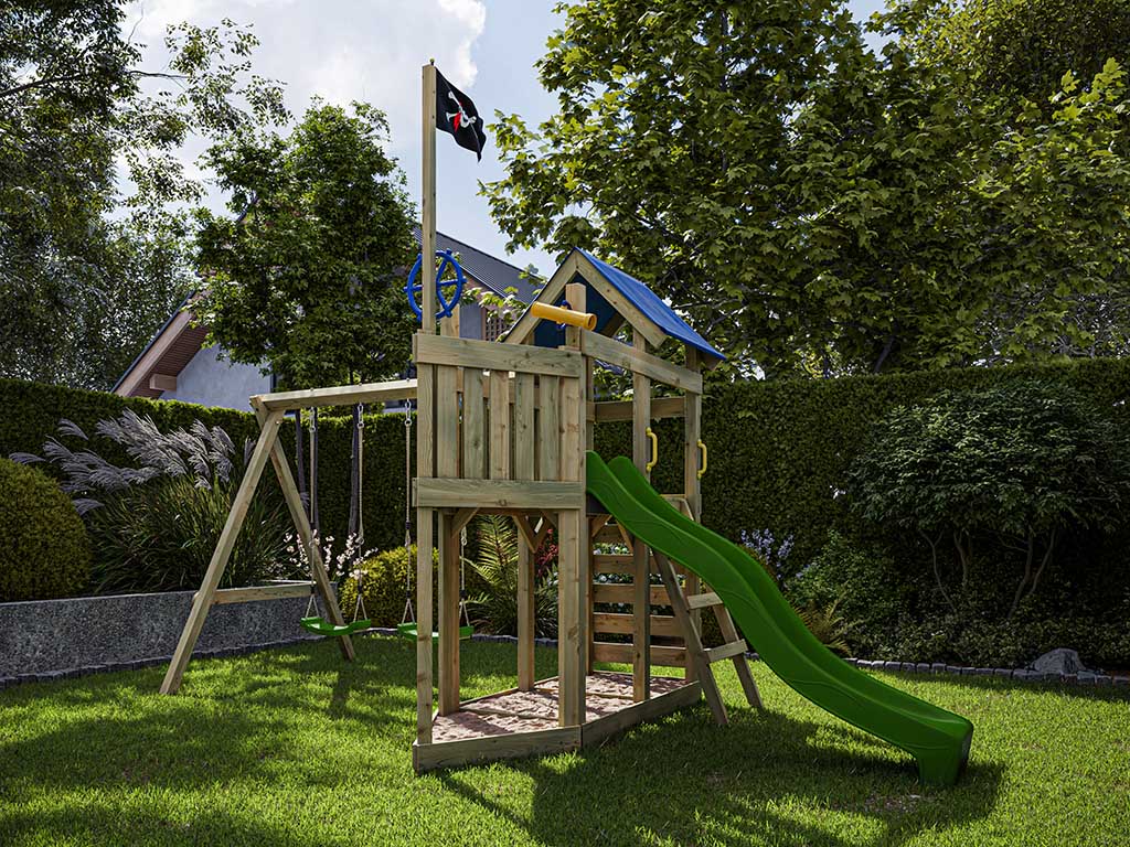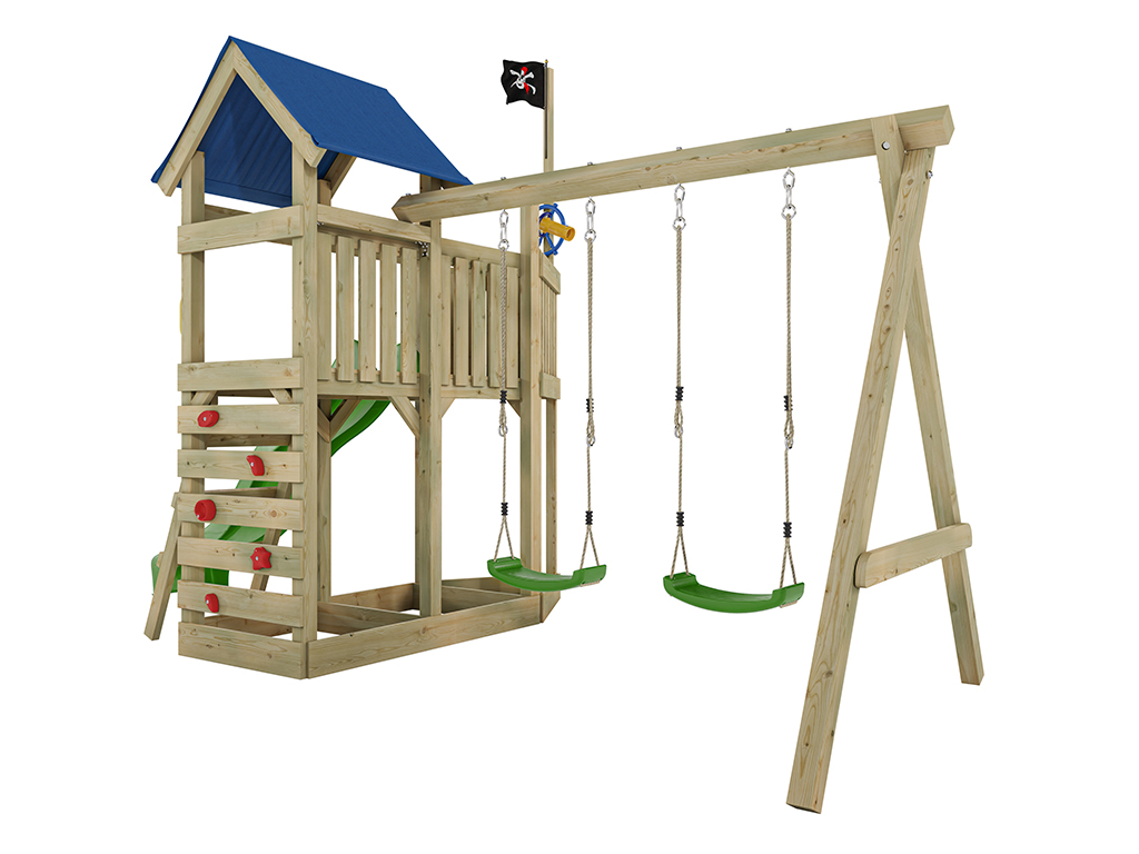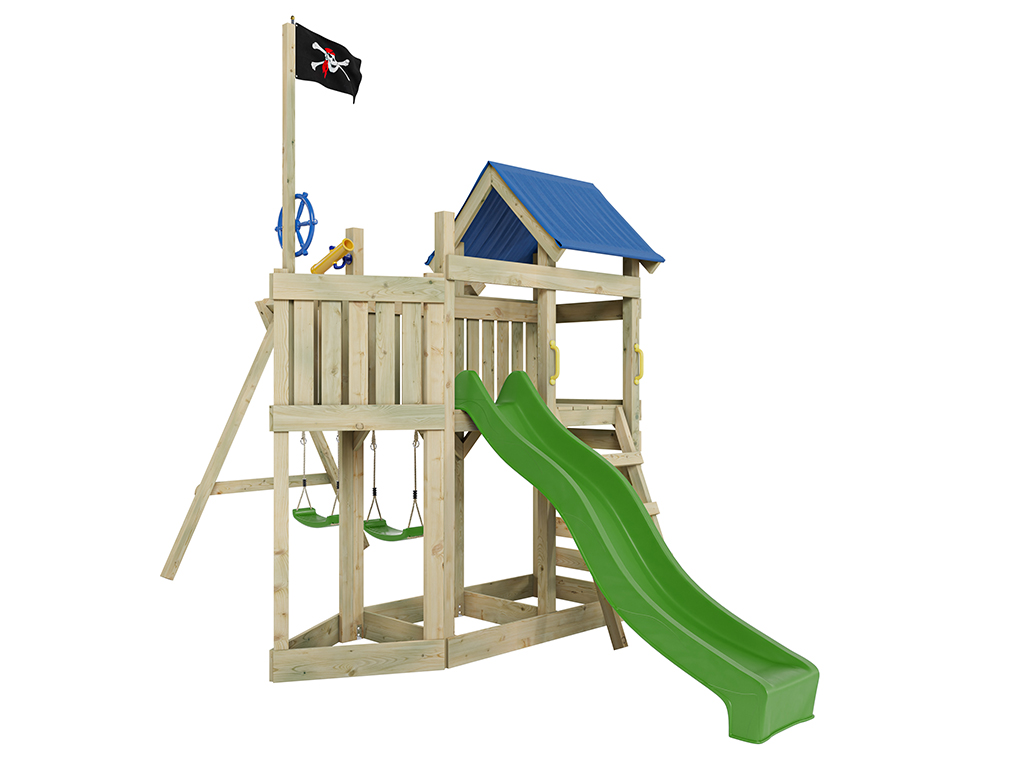 Spielturm Pirat Captain Snappy KDI mit Doppelschaukel inkl. Rutsche grün + Sitze grün
