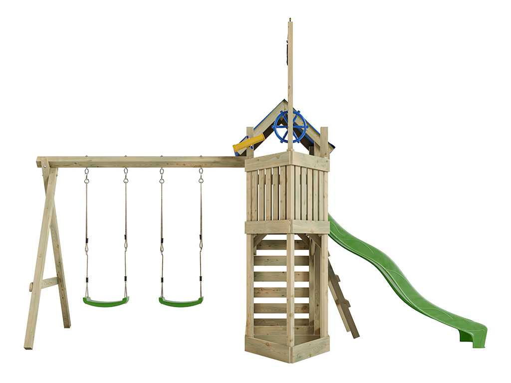 - Inklusive einer Doppelschaukel in Grün mit 9 x 9 cm starkem Schaukelbalken.