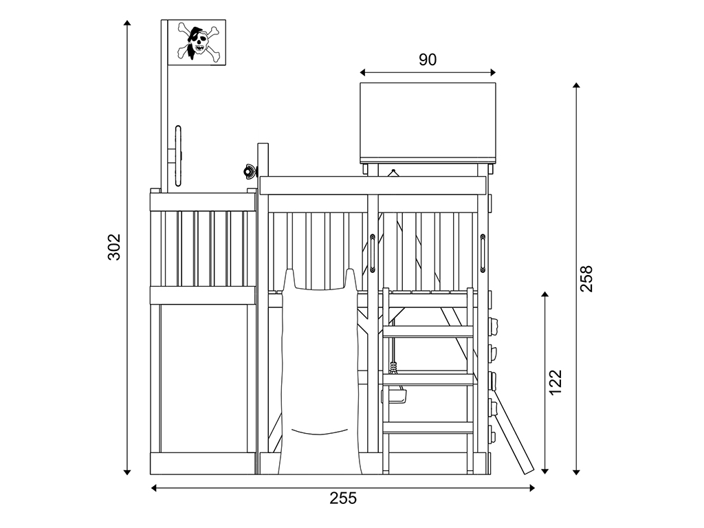 Für kleine Entdecker und große Piraten bietet dir der Spielturm eine Captain-Jolly-Flagge. Dieser Name ist das berühmte Symbol für alle Piraten. Aus der Ferne erkennbar und der Traum eines jeden Piraten, unter einem zu segeln. Das große Schiff mit seinen 507 x 255 x 258 cm bietet ein Dach, um vor der rauen See zu schützen und unbekannte Inseln auch bei Stürmen zu finden. Die Aussichtsplattform wurde dafür auf 122 cm Höhe angesetzt. Um sich schnell ins Abenteuer zu stürzen, findet sich eine blaue Rutsche an Backbord (links). Doch um wieder schnell in See zu stechen, ist eine Kletterwand am Heck des Schiffes oder eine Leiter an der Steuerbord Seite. Sollten andere Piraten auf hoher See auftauchen, ist das Schiff mit einer Doppelschaukel ausgerüstet, um schnell auf das andere Schiff zu gelangen.