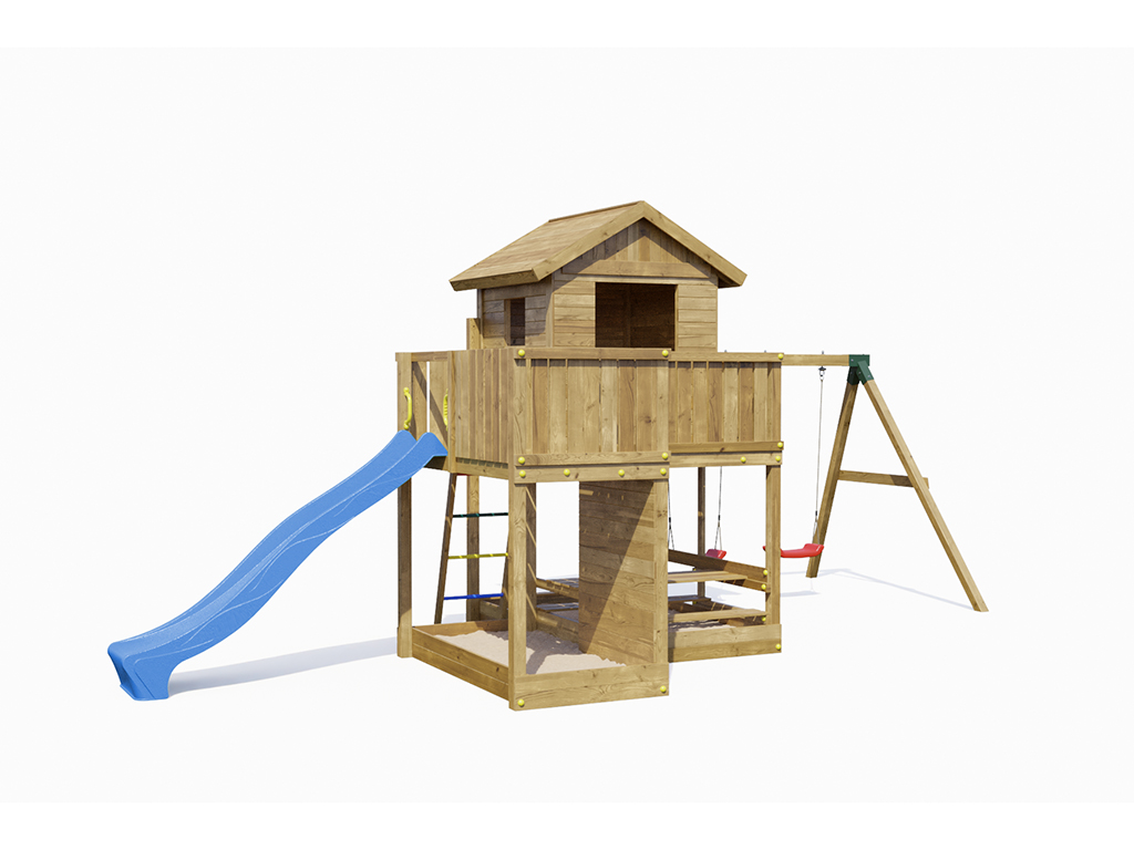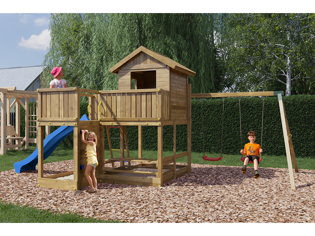 Die Podesthöhe von 125 cm ermöglicht einen tollen Blick über den Garten und die Nachbarschaft. Die zusätzlichen Erweiterungen wie Doppelschaukel, Spielhaus, Sandkasten und Kletterwand bieten vielfältige Spielmöglichkeiten für Kinder jeden Alters.