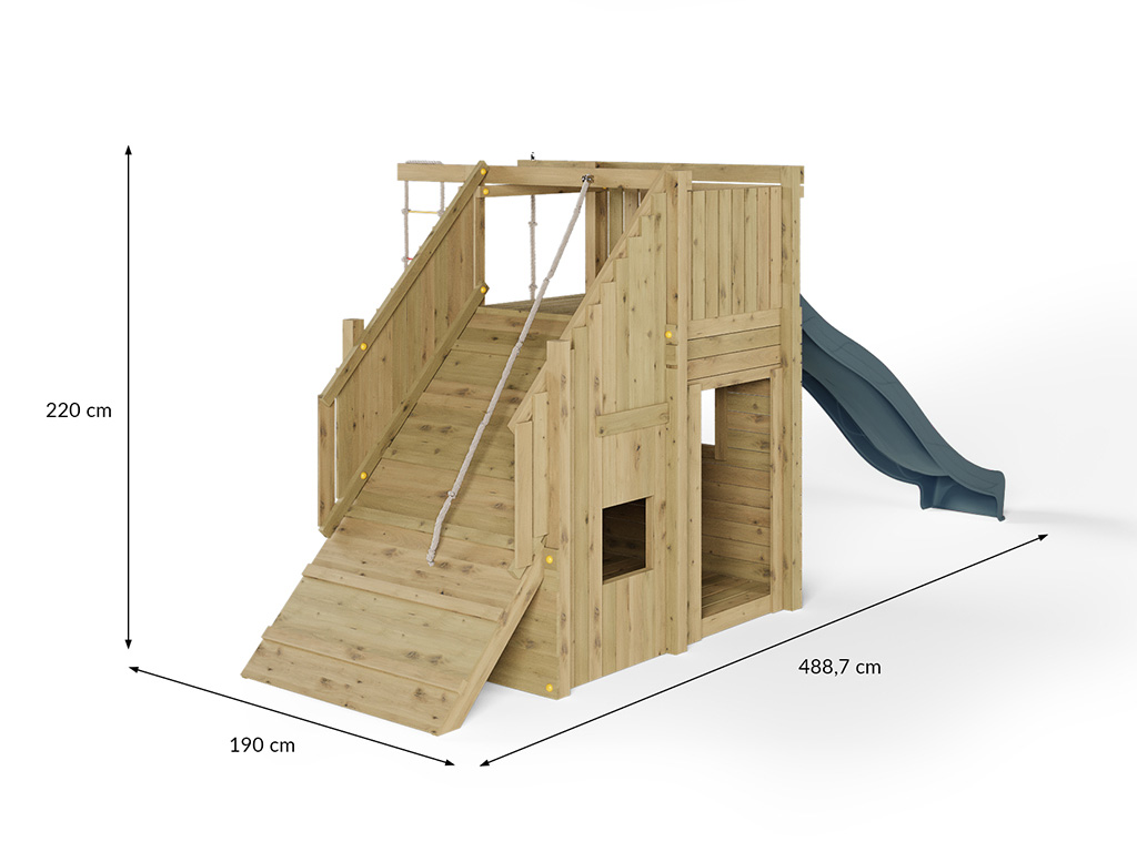 B x T x H: 488,7 x 190 x 220 cm, inkl. Kletterwand + Knotenseil + Strickleiter, inkl. Rampe + Rutsche grau