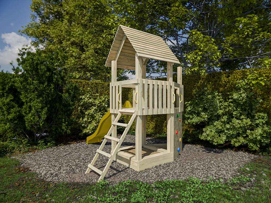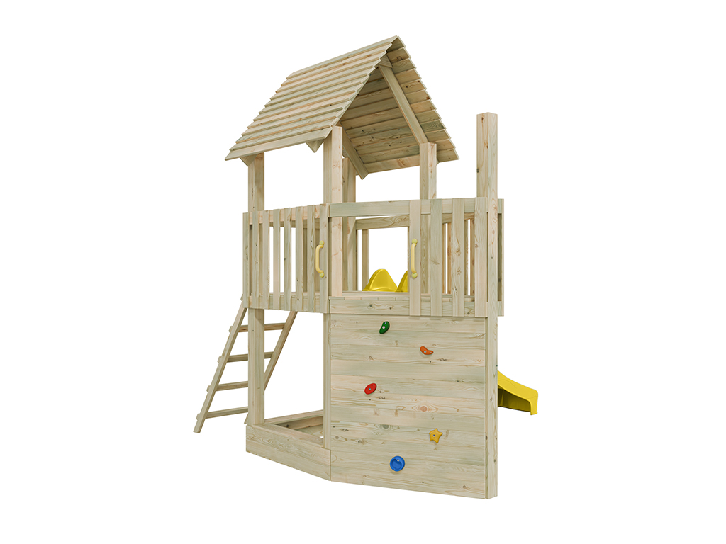 Der Spielturm wird mit Kletterwand, Sandkasten und Rutsche geliefert und sorgt für großes Spielvergnügen bei den Kindern.