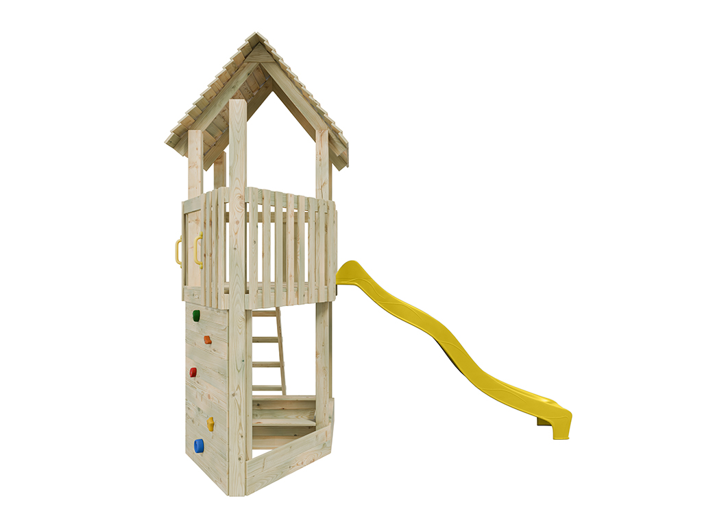 Der Spielturm ist aus kesseldruckimprägniertem Kiefernholz gefertigt und ist somit besonders witterungsbeständig. Die 7 x 7 cm starken Pfosten gewährleisten höchste Stabilität. Stabile Brüstungsgeländer schützen die Kleinen und laden zum Versteckspiel ein. Das stabile Satteldach mit überlappenden Holzbrettern schützt für Sonne und Regen. Nach vollständiger Trocknung kann das Spielhaus nach Lust und Laune mit einem Farbanstrich gestrichen werden. Wir empfehlen hierzu eine offenporige, hoch pigmentierte Holzschutzfarbe. Beachte hierzu unser großes Zubehörsortiment. - Inkl. Rutsche