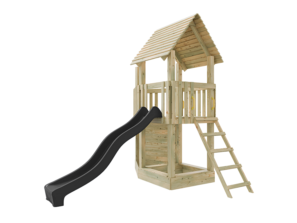 Der Spielturm ist aus kesseldruckimprägniertem Kiefernholz gefertigt und ist somit besonders witterungsbeständig. Die 7 x 7 cm starken Pfosten gewährleisten höchste Stabilität. Stabile Brüstungsgeländer schützen die Kleinen und laden zum Versteckspiel ein. Das stabile Satteldach mit überlappenden Holzbrettern schützt für Sonne und Regen. Nach vollständiger Trocknung kann das Spielhaus nach Lust und Laune mit einem Farbanstrich gestrichen werden. Wir empfehlen hierzu eine offenporige, hoch pigmentierte Holzschutzfarbe. Beachte hierzu unser großes Zubehörsortiment. - Inkl. Rutsche