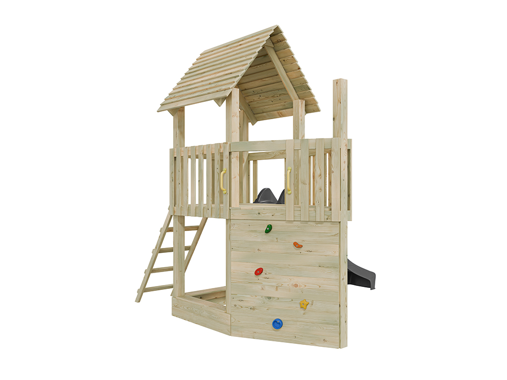 Der Spielturm wird mit Kletterwand, Sandkasten und Rutsche geliefert und sorgt für großes Spielvergnügen bei den Kindern.