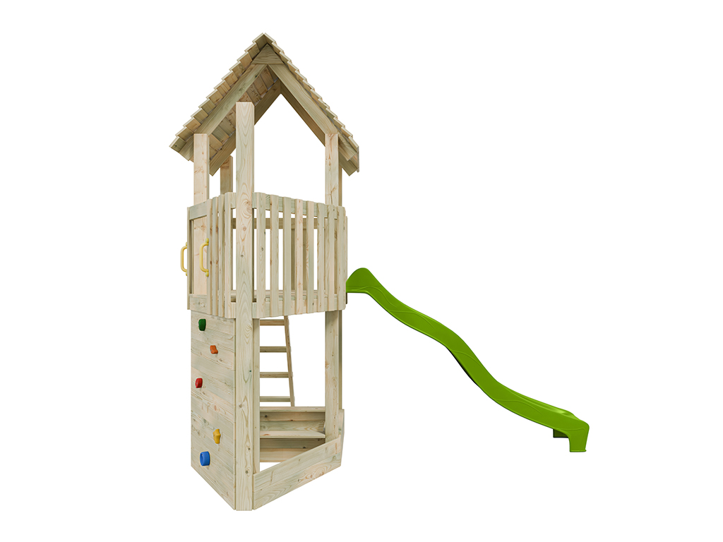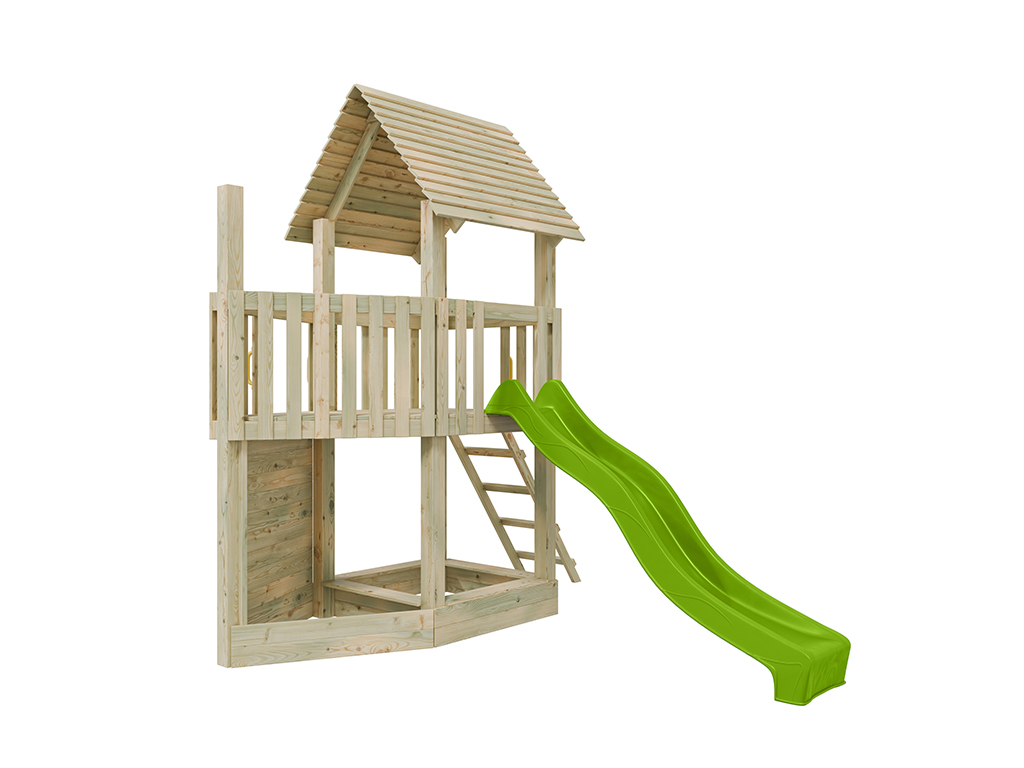 Der Spielturm ist aus kesseldruckimprägniertem Kiefernholz gefertigt und ist somit besonders witterungsbeständig. Die 7 x 7 cm starken Pfosten gewährleisten höchste Stabilität. Stabile Brüstungsgeländer schützen die Kleinen und laden zum Versteckspiel ein. Das stabile Satteldach mit überlappenden Holzbrettern schützt für Sonne und Regen. Nach vollständiger Trocknung kann das Spielhaus nach Lust und Laune mit einem Farbanstrich gestrichen werden. Wir empfehlen hierzu eine offenporige, hoch pigmentierte Holzschutzfarbe. Beachte hierzu unser großes Zubehörsortiment. - Inkl. Rutsche