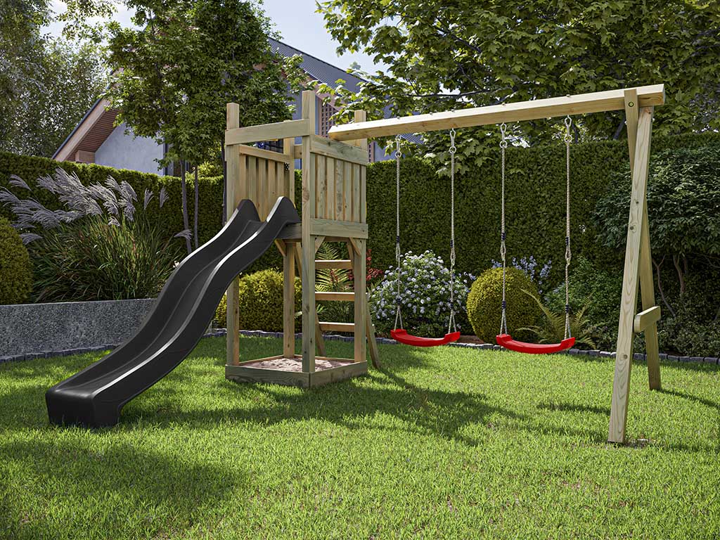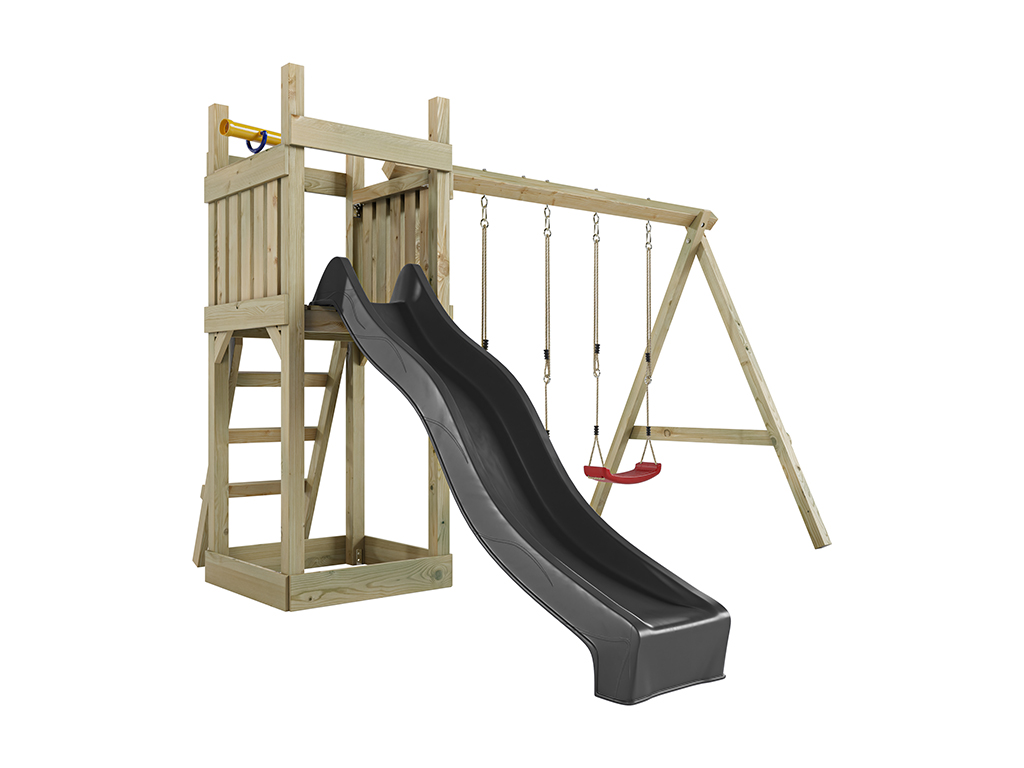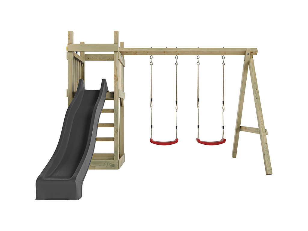 Spielturm Skinny KDI inkl. Doppelschaukel inkl. Rutsche grau + Sitze rot