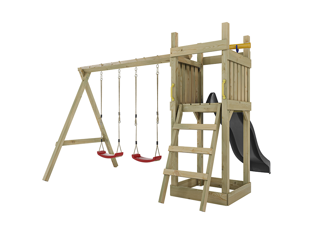 Spielturm Skinny KDI inkl. Doppelschaukel inkl. Rutsche grau + Sitze rot