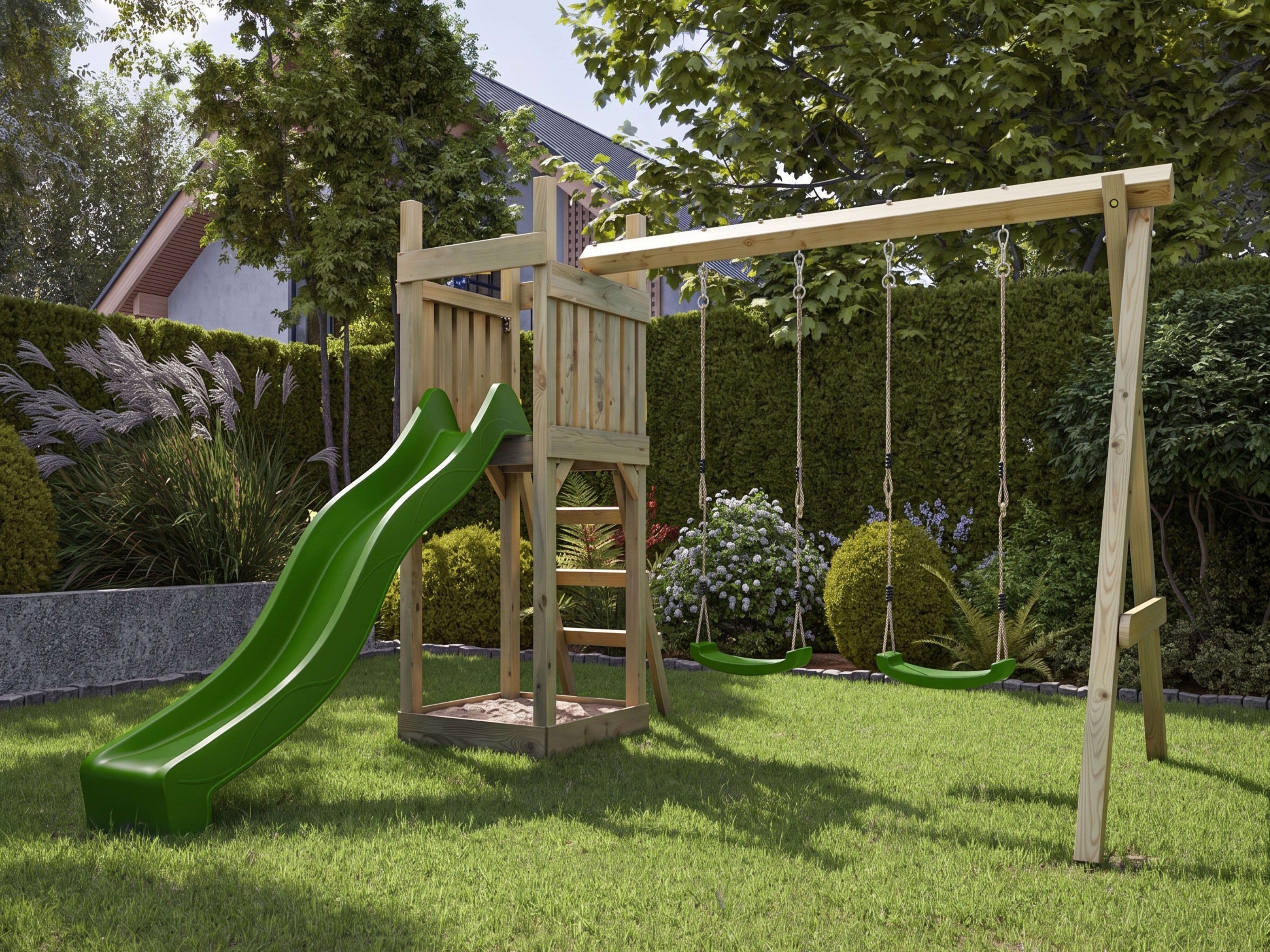 Outgarden Spielturm Skinny KDI inkl. Doppelschaukel inkl. Rutsche grün + Sitze grün