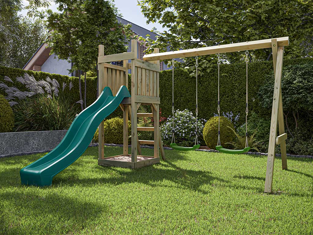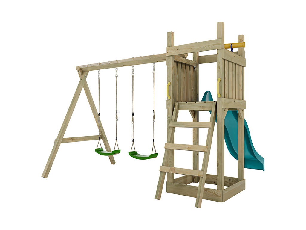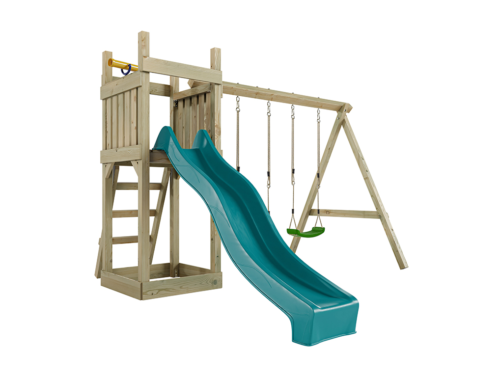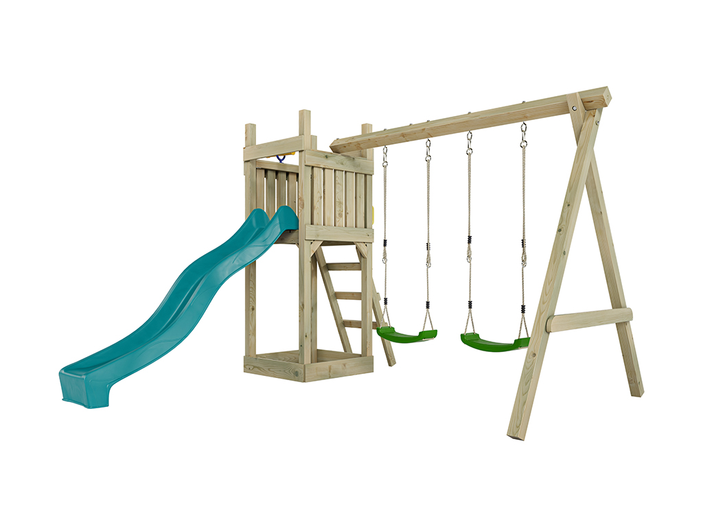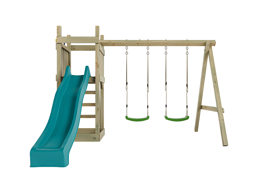Spielturm Skinny KDI inkl. Doppelschaukel inkl. Rutsche türkis + Sitze grün