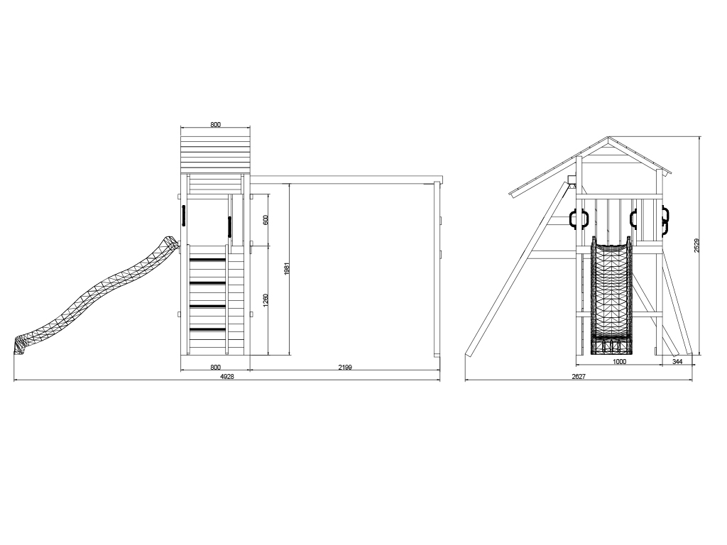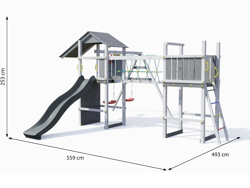 Bei diesem Spielturm steht viel Bewegung auf dem Programm. Ein eigenes Abenteuerland für dein Kind für jede Menge Spiel und Spaß! Das Außenmaß dieses Spielturms beträgt B x T: 559 x 493 cm. Die Firsthöhe liegt bei 253 cm.