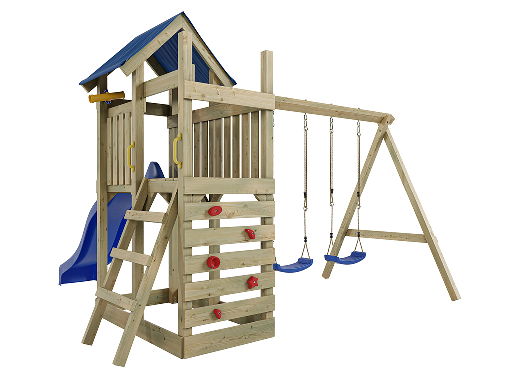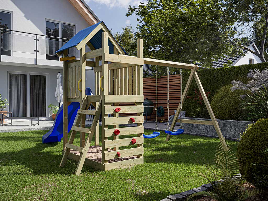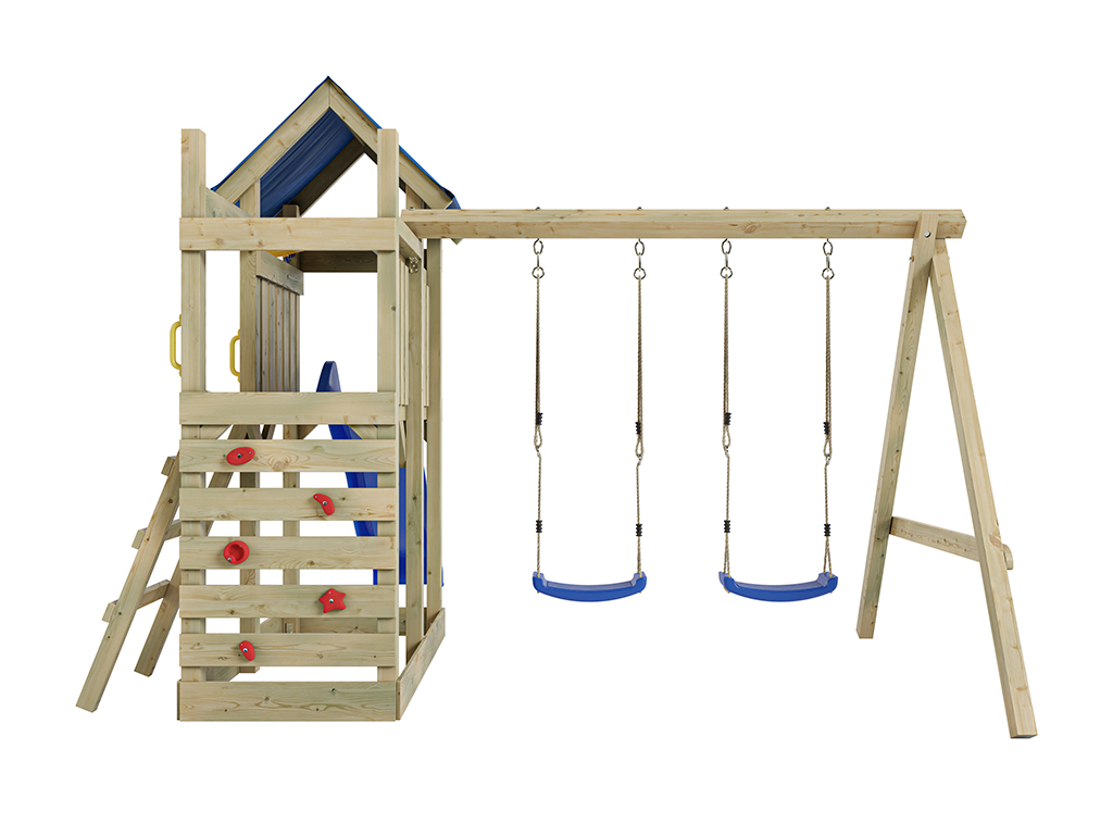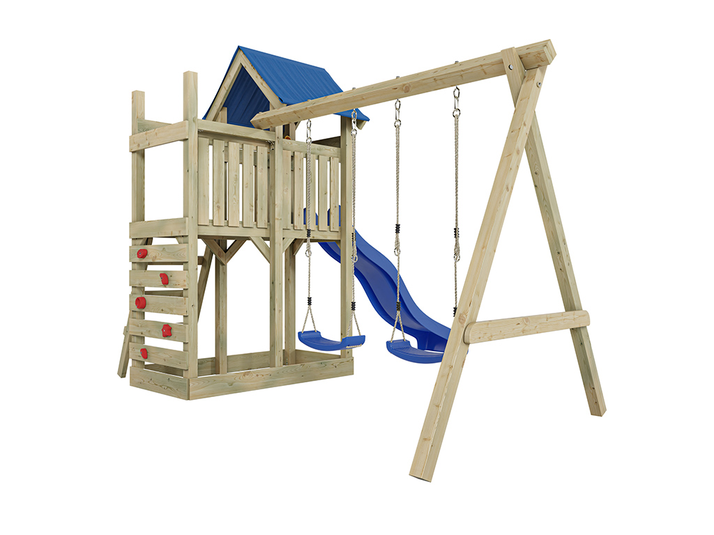 - Inklusive einer Doppelschaukel in Blau mit 9 x 9 cm starkem Schaukelbalken.