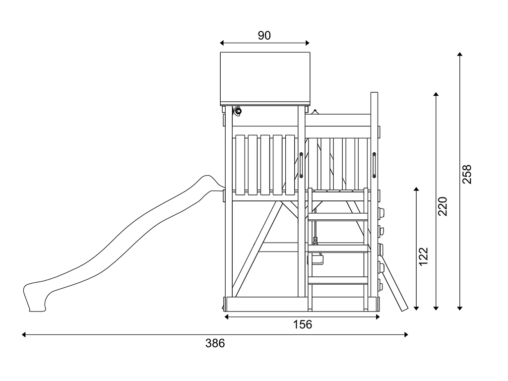 Dieser Spielturm bietet deinem Kind einzigartige Erlebnisse mit viel Bewegung und Abenteuer – ein wahrer Spieltraum! Das Außenmaß dieses Spielturms beträgt 355 x 386 cm. Die Firsthöhe liegt bei 258 cm.