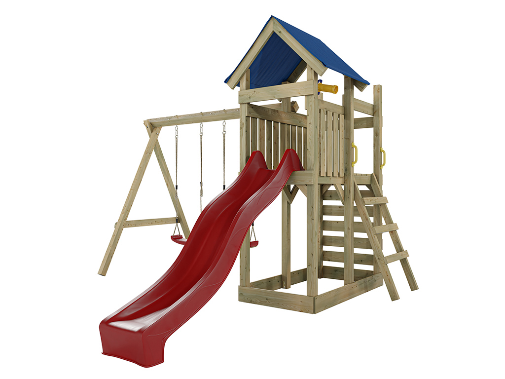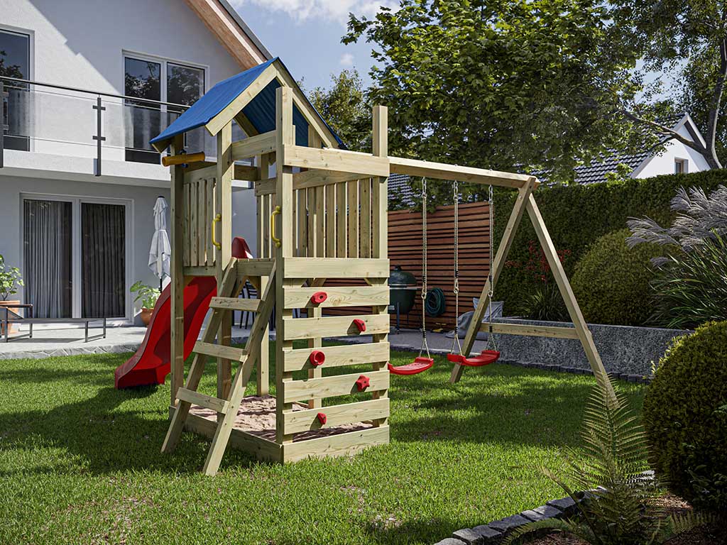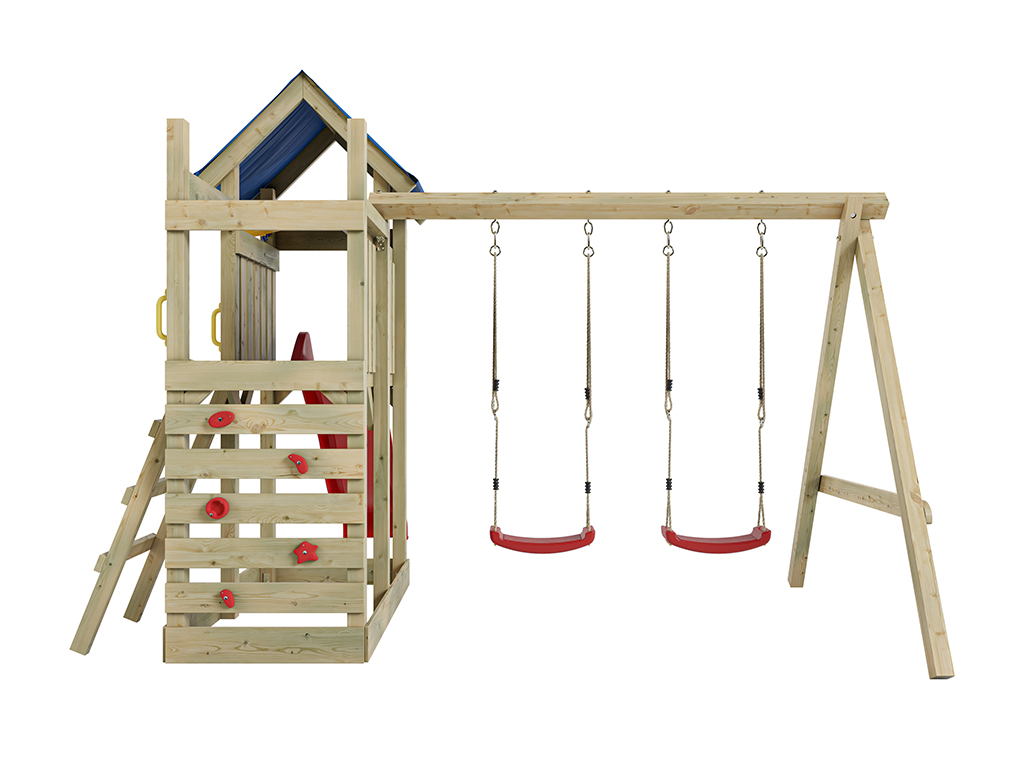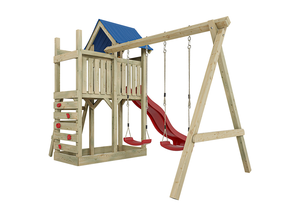 - Inklusive einer Doppelschaukel in Rot mit 9 x 9 cm starkem Schaukelbalken.