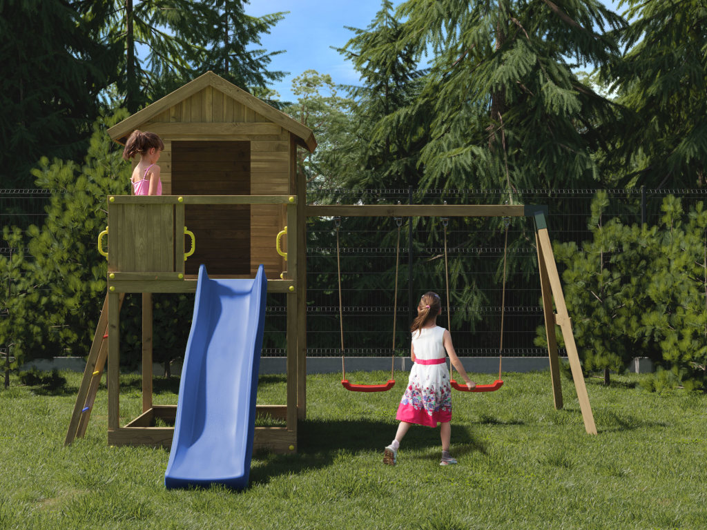 Die Grundkonstruktion des Spielturms ist besonders witterungsbeständig. Die massiven 7 x 7 cm starken Pfosten aus robustem Nadelholz wurden kesseldruckimprägniert. Das Spielhaus ist durch das spezielle Holzschutzverfahren der Kesseldruckimprägnierung, bei dem eine Salz-Wasserlösung (chromfrei sowie umweltfreundlich und unbedenklich) porentief in das Holz gepresst wird, vor Fäulnis und holzzerstörenden Pilzen für viele Jahre geschützt. Das Spielhaus benötigt daher keinen weiteren Schutzanstrich. Das Imprägniersalz schützt die Holzzellen und das Wasser kann danach wieder entweichen. Je nach Witterungsbedingungen kann dieser Trocknungsprozess langsam oder schnell gehen. Um das natürliche Vergrauen durch die Witterung kannst du dein Spielhaus gerne - aber erst nach vollständiger Trocknung - individuell farbig gestalten. Wir empfehlen dazu eine deckende, offenporige Holzschutzlasur. Weitere Informationen zur Kesseldruckimprägnierung findest du im "Infoblatt Kesseldruckimprägnierung" in unserem Downloadbereich. - Inkl. Doppelschaukel