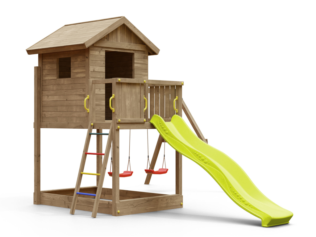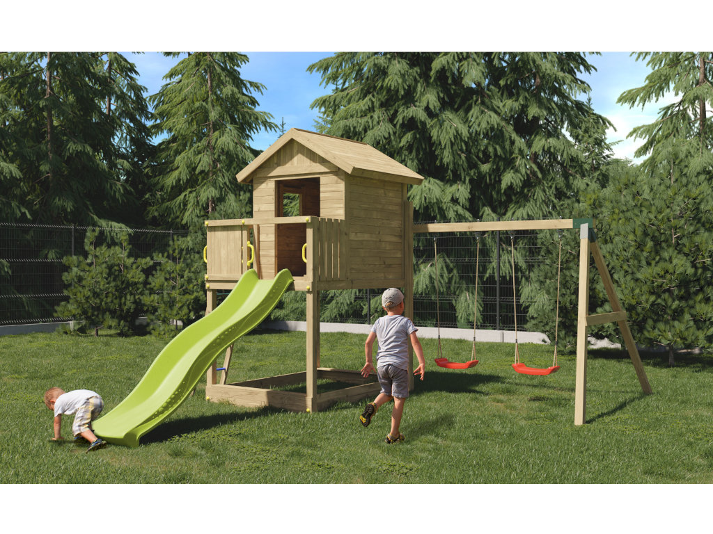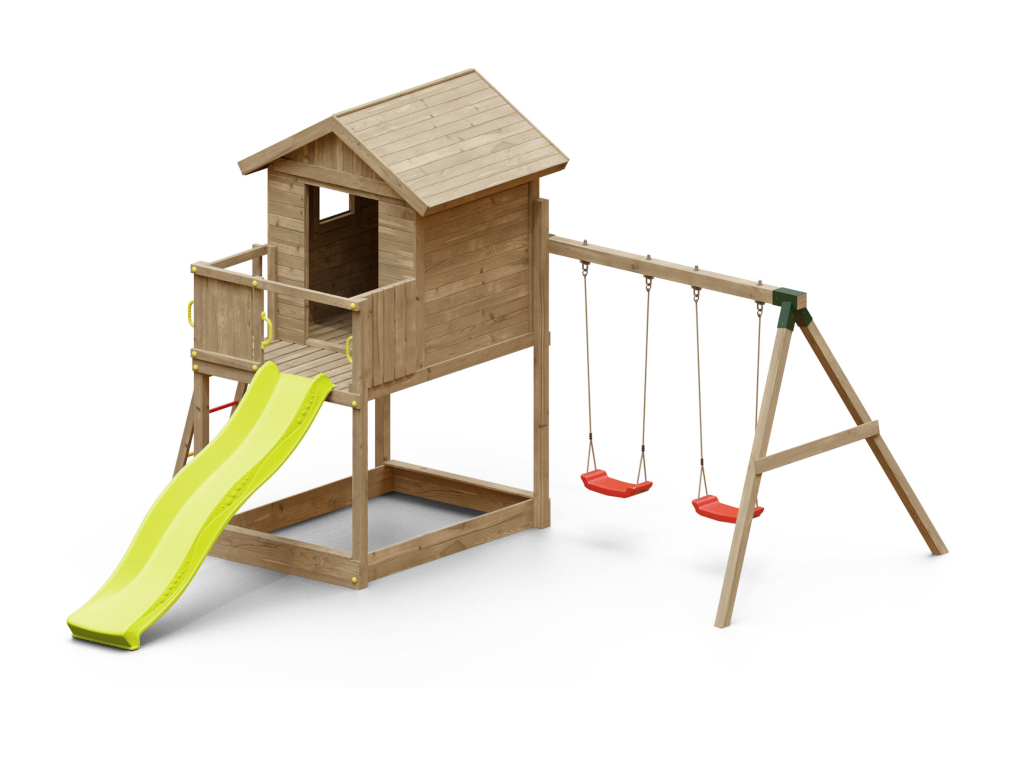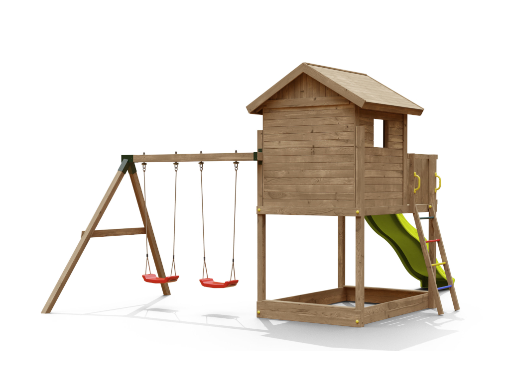Die Grundkonstruktion des Spielturms ist besonders witterungsbeständig. Die massiven 7 x 7 cm starken Pfosten aus robustem Nadelholz wurden kesseldruckimprägniert. Das Spielhaus ist durch das spezielle Holzschutzverfahren der Kesseldruckimprägnierung, bei dem eine Salz-Wasserlösung (chromfrei sowie umweltfreundlich und unbedenklich) porentief in das Holz gepresst wird, vor Fäulnis und holzzerstörenden Pilzen für viele Jahre geschützt. Das Spielhaus benötigt daher keinen weiteren Schutzanstrich. Das Imprägniersalz schützt die Holzzellen und das Wasser kann danach wieder entweichen. Je nach Witterungsbedingungen kann dieser Trocknungsprozess langsam oder schnell gehen. Um das natürliche Vergrauen durch die Witterung kannst du dein Spielhaus gerne - aber erst nach vollständiger Trocknung - individuell farbig gestalten. Wir empfehlen dazu eine deckende, offenporige Holzschutzlasur. Weitere Informationen zur Kesseldruckimprägnierung findest du im "Infoblatt Kesseldruckimprägnierung" in unserem Downloadbereich. - Inkl. Doppelschaukel