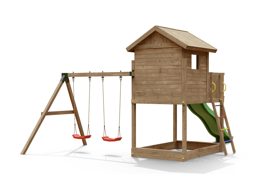 Die Grundkonstruktion des Spielturms ist besonders witterungsbeständig. Die massiven 7 x 7 cm starken Pfosten aus robustem Nadelholz wurden kesseldruckimprägniert. Das Spielhaus ist durch das spezielle Holzschutzverfahren der Kesseldruckimprägnierung, bei dem eine Salz-Wasserlösung (chromfrei sowie umweltfreundlich und unbedenklich) porentief in das Holz gepresst wird, vor Fäulnis und holzzerstörenden Pilzen für viele Jahre geschützt. Das Spielhaus benötigt daher keinen weiteren Schutzanstrich. Das Imprägniersalz schützt die Holzzellen und das Wasser kann danach wieder entweichen. Je nach Witterungsbedingungen kann dieser Trocknungsprozess langsam oder schnell gehen. Um das natürliche Vergrauen durch die Witterung kannst du dein Spielhaus gerne - aber erst nach vollständiger Trocknung - individuell farbig gestalten. Wir empfehlen dazu eine deckende, offenporige Holzschutzlasur. Weitere Informationen zur Kesseldruckimprägnierung findest du im "Infoblatt Kesseldruckimprägnierung" in unserem Downloadbereich. - Inkl. Doppelschaukel