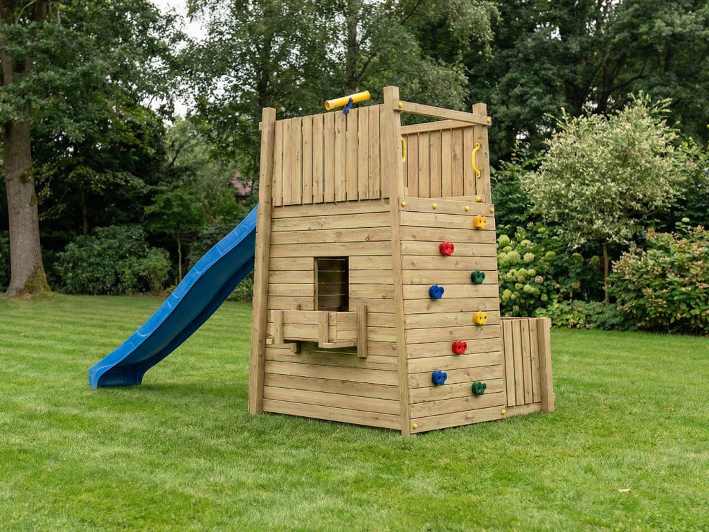 - Spielturm, 4x Haltegriff, 4x Bodenanker, 8 bunte Klettersteine, 1x Spielteleskop, Rutsche