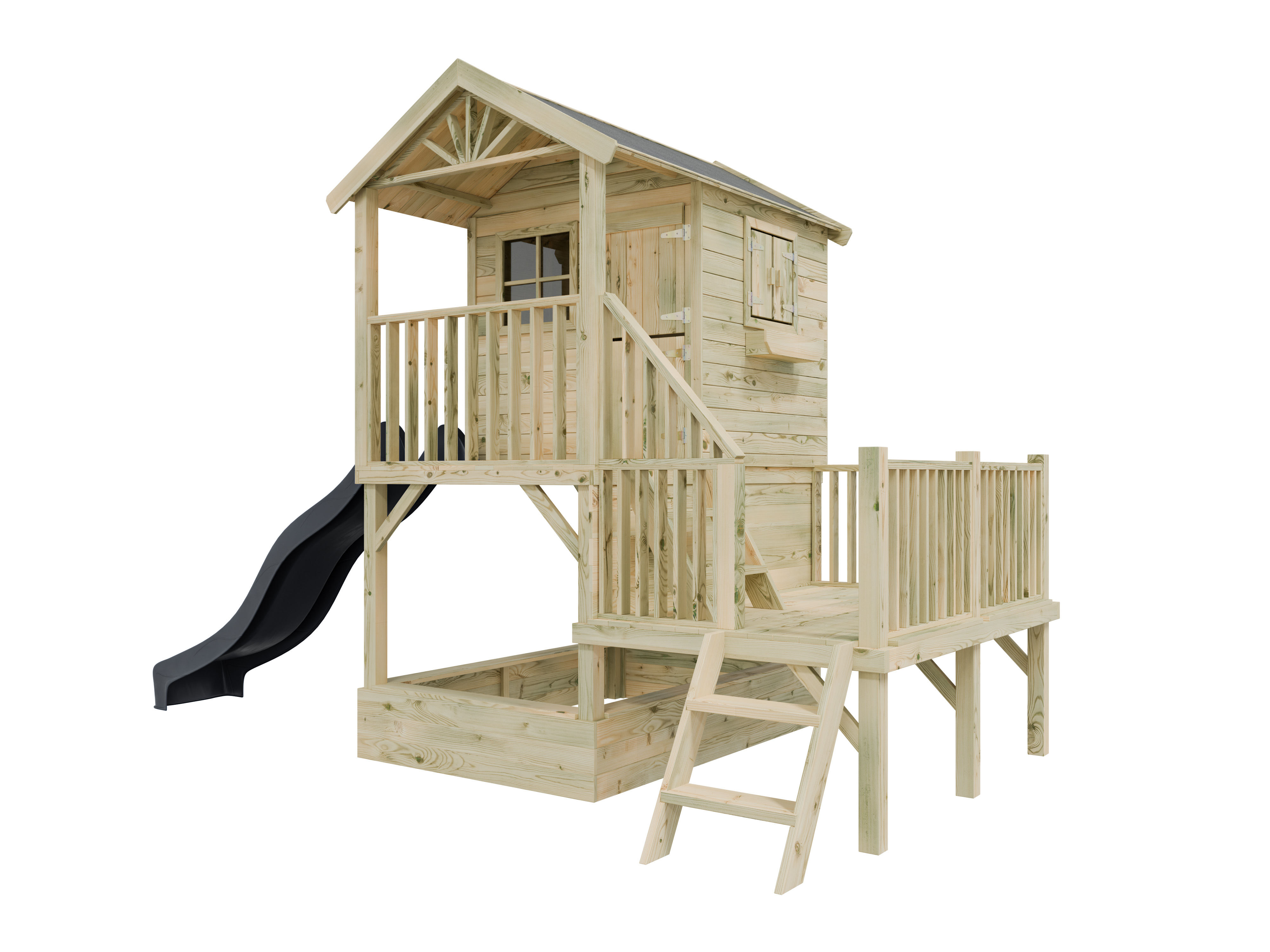 Das Stelzenhaus mit großzügiger Veranda ist mit einem nach außen zu öffnenden Fenster mit Fensterläden in der Seitenwand und einem feststehenden Kunstglasfenster in der Front ausgestattet. Ein Blumenkasten ist ebenfalls enthalten. Das Spielhaus bietet genug Platz für mehrere Kinder und lässt sich ganz nach der Vorstellung der Kleinen durch z.B. eine Kinderküche erweitern.