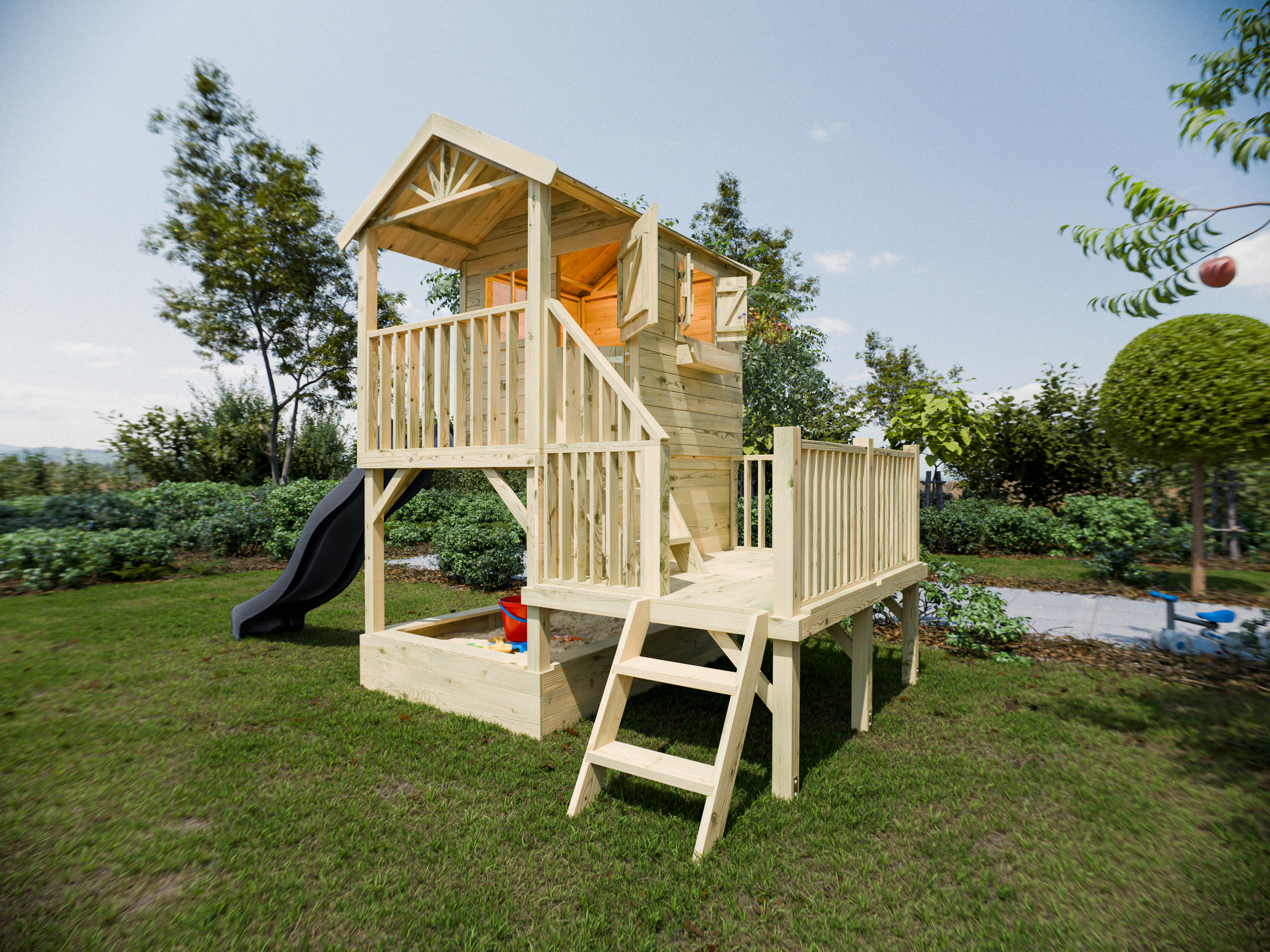 Das große Stelzenhaus mit großzügigem Seitenpodest lässt Kinderherzen höher schlagen.