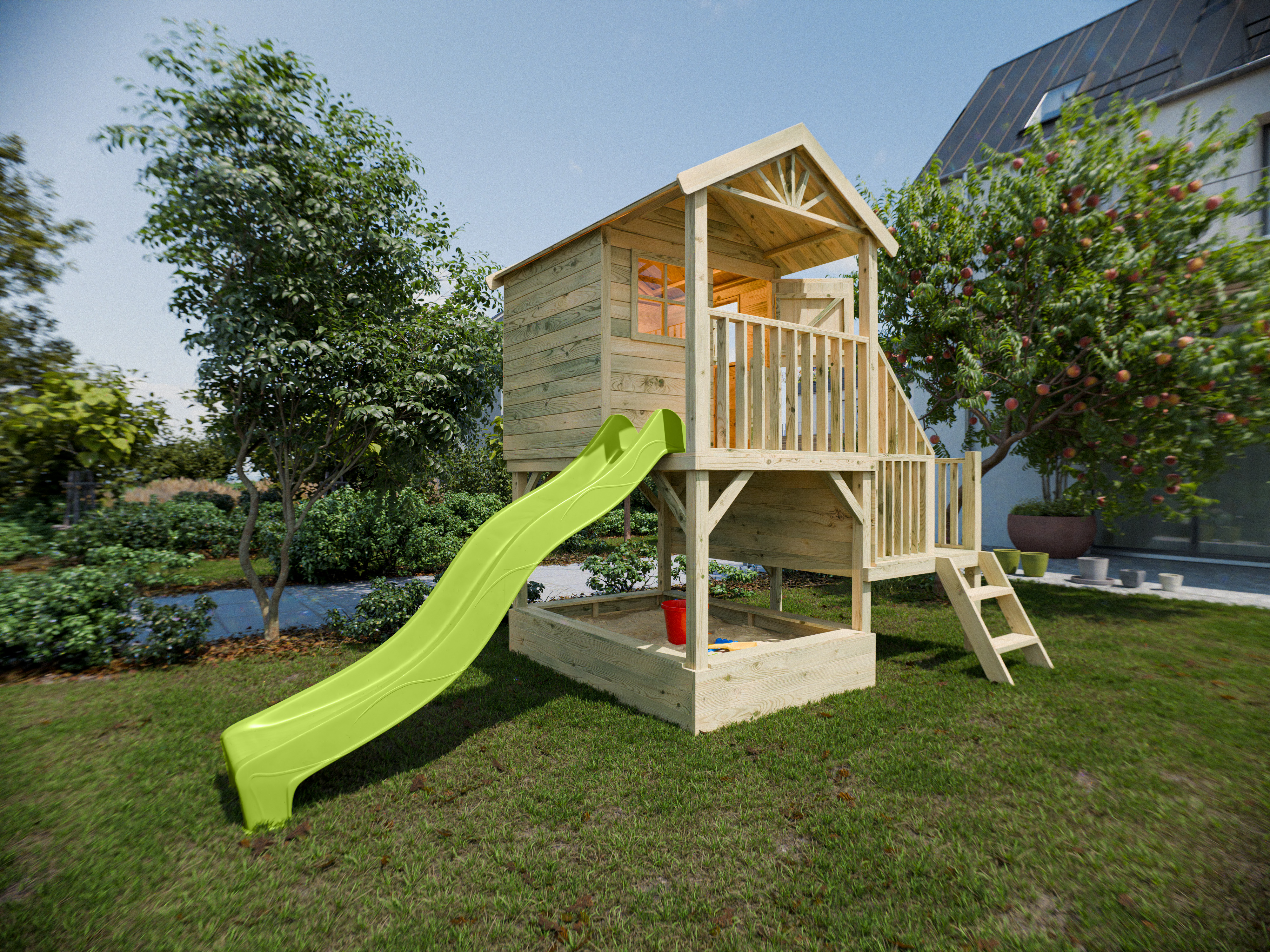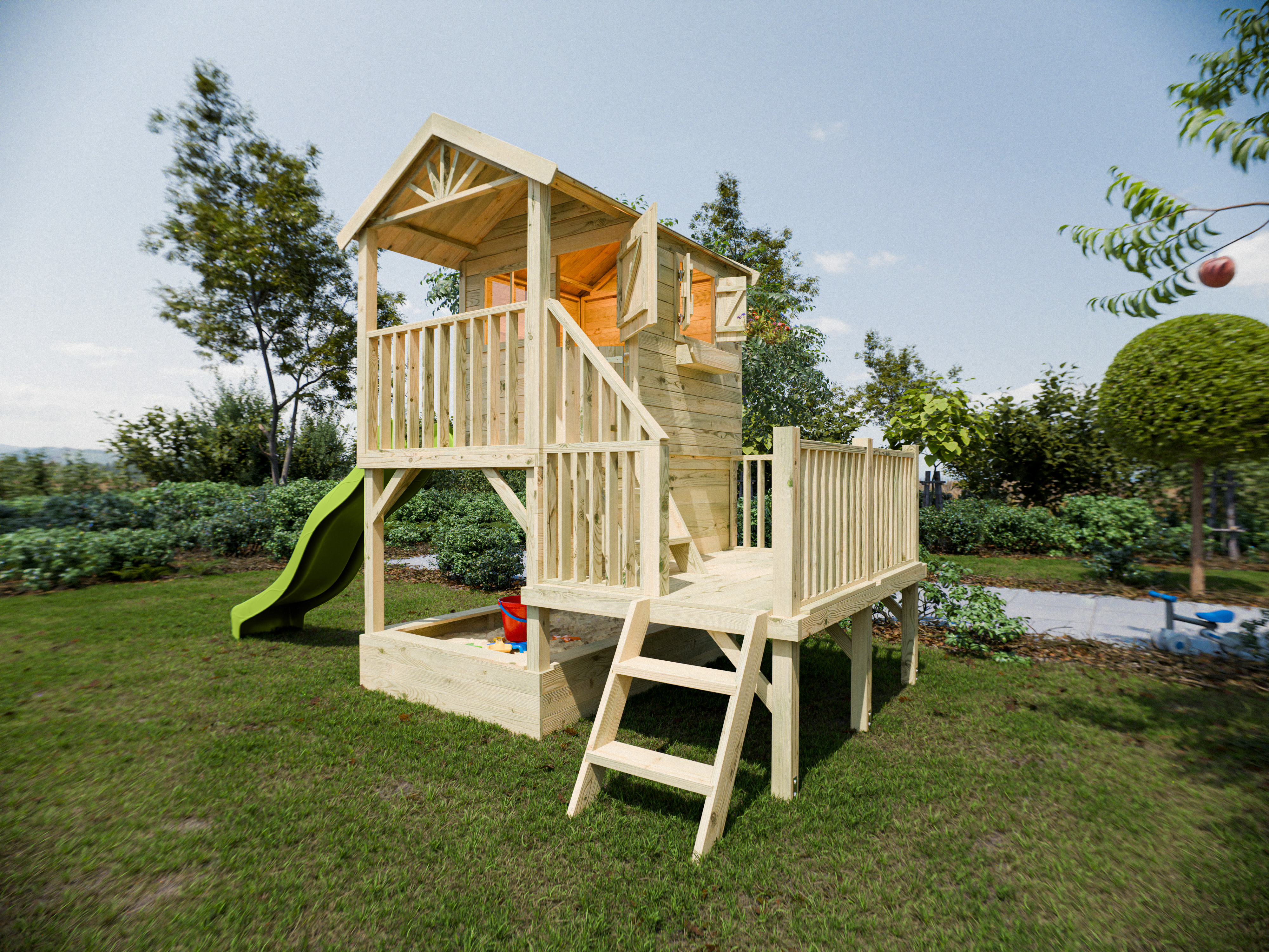 Das große Stelzenhaus mit großzügigem Seitenpodest lässt Kinderherzen höher schlagen.
