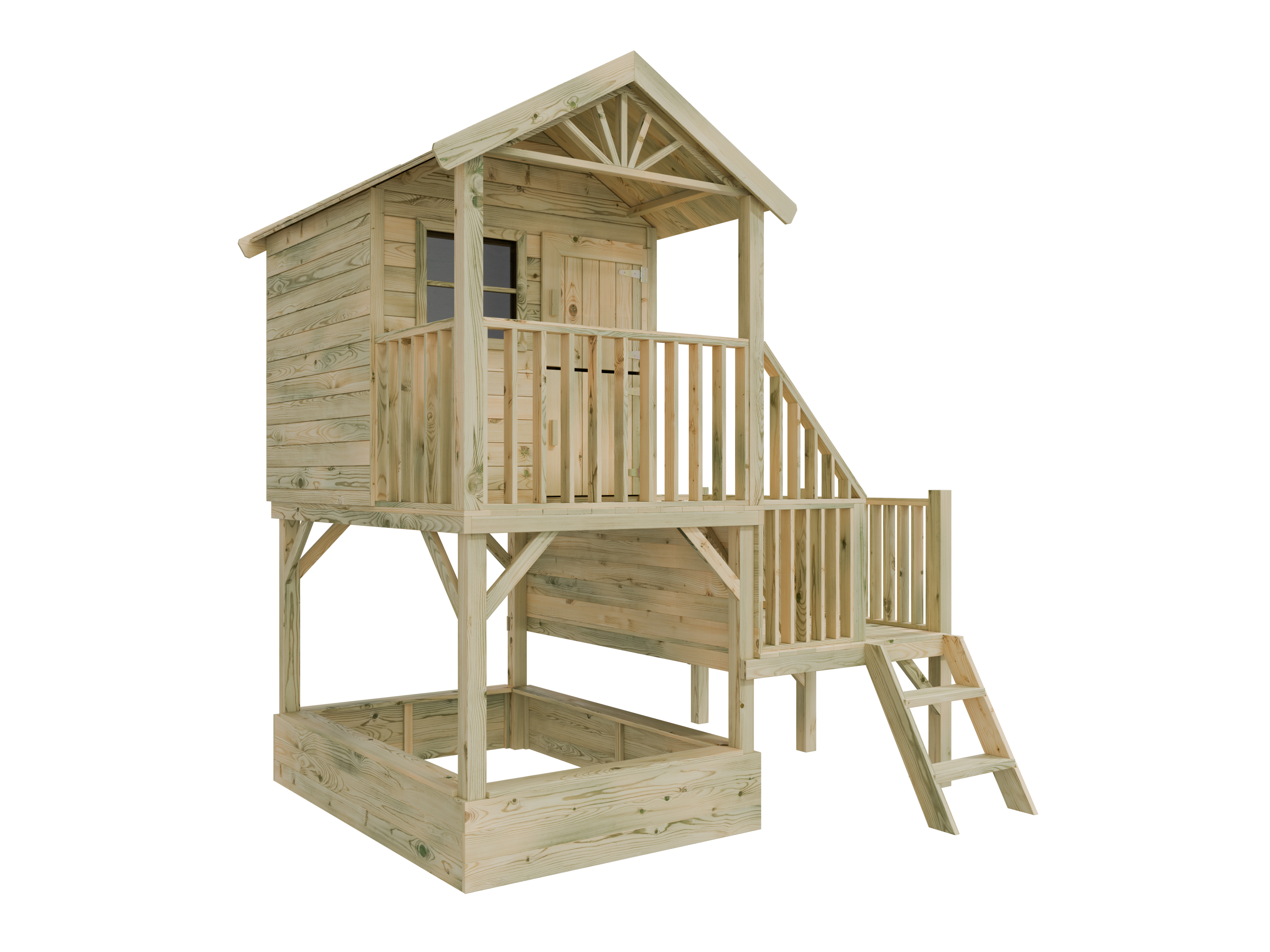 Das Stelzenhaus mit großzügiger Veranda ist mit einem nach außen zu öffnenden Fenster mit Fensterläden in der Seitenwand und einem feststehenden Kunstglasfenster in der Front ausgestattet. Ein Blumenkasten ist ebenfalls enthalten. Das Spielhaus bietet genug Platz für mehrere Kinder und lässt sich ganz nach der Vorstellung der Kleinen durch z.B. eine Kinderküche erweitern. - Inkl. Sandkasten