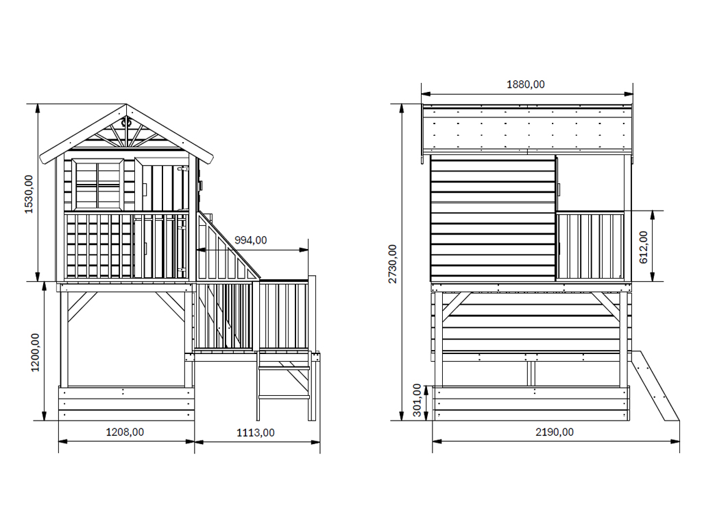 B x T x H: 232,1 x 219 x 273 cm, inkl. Sandkasten, zwei Podeste (120 cm und 60 cm)