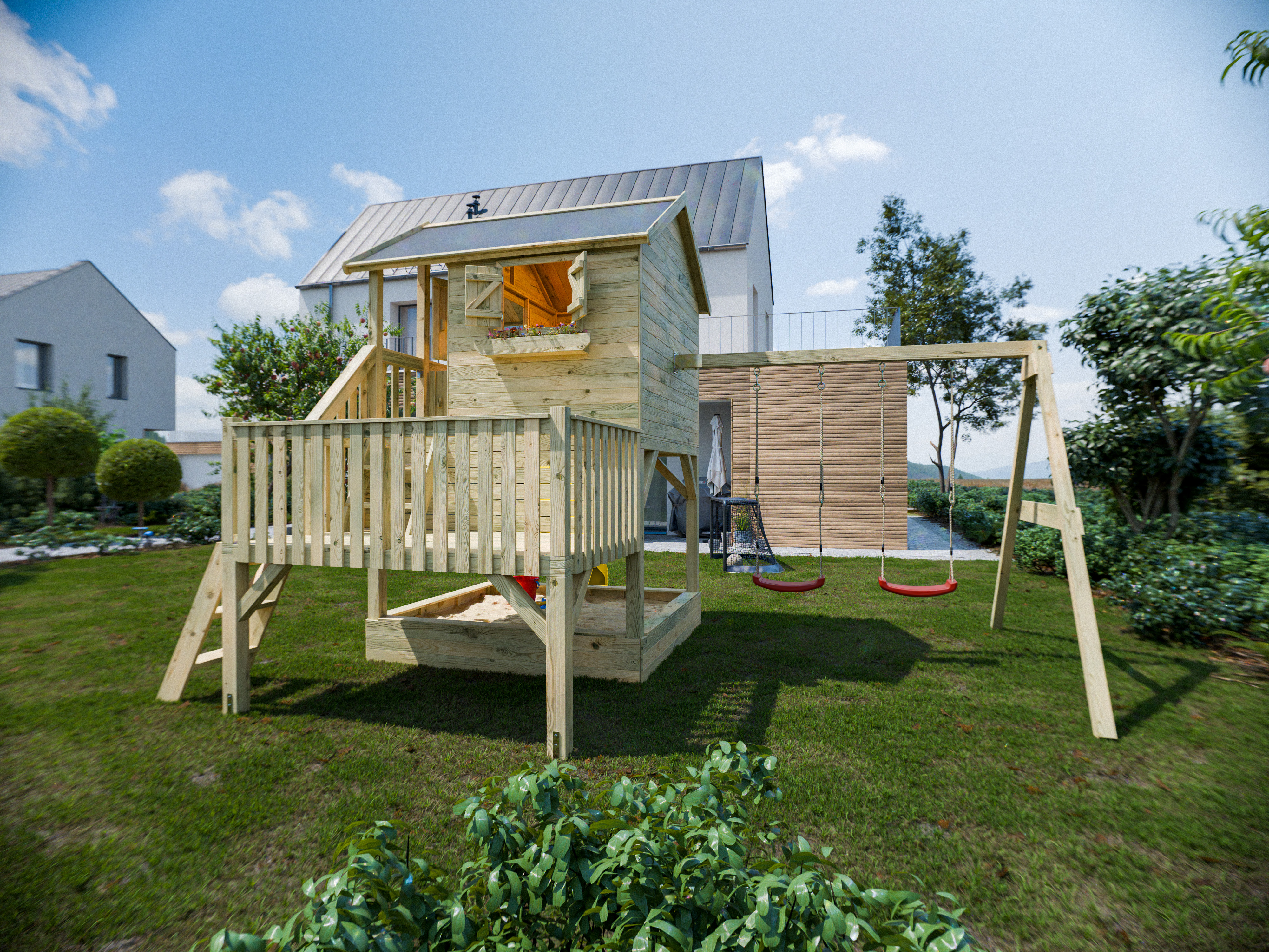 Das Stelzenhaus wird mit Doppelschaukelanbau (7 x 7 cm starke Pfosten, 9 x 9 cm starker Querbalken) inklusive zwei Schaukelsitzen geliefert. Bitte beachte, dass der Schaukelanbau nur wie abgebildet auf der Rückseite des Stelzenhauses montiert werden kann. An der Seitenwand mit offenem Fensterausschnitt ist dies aus Sicherheitsgründen nicht möglich.