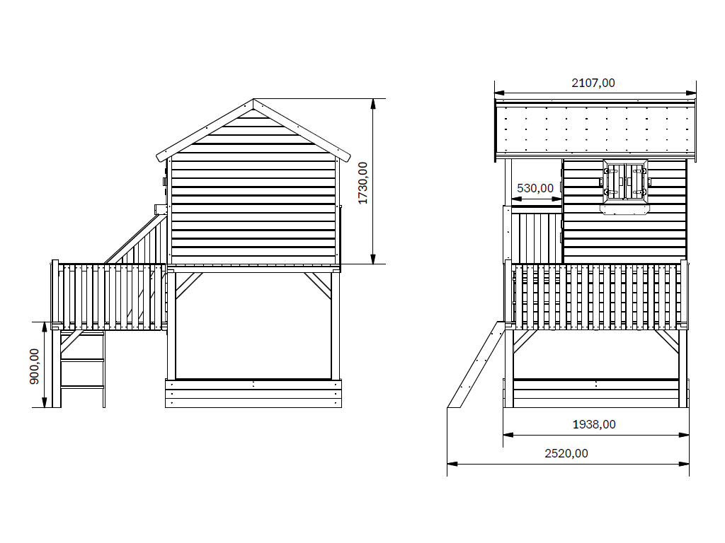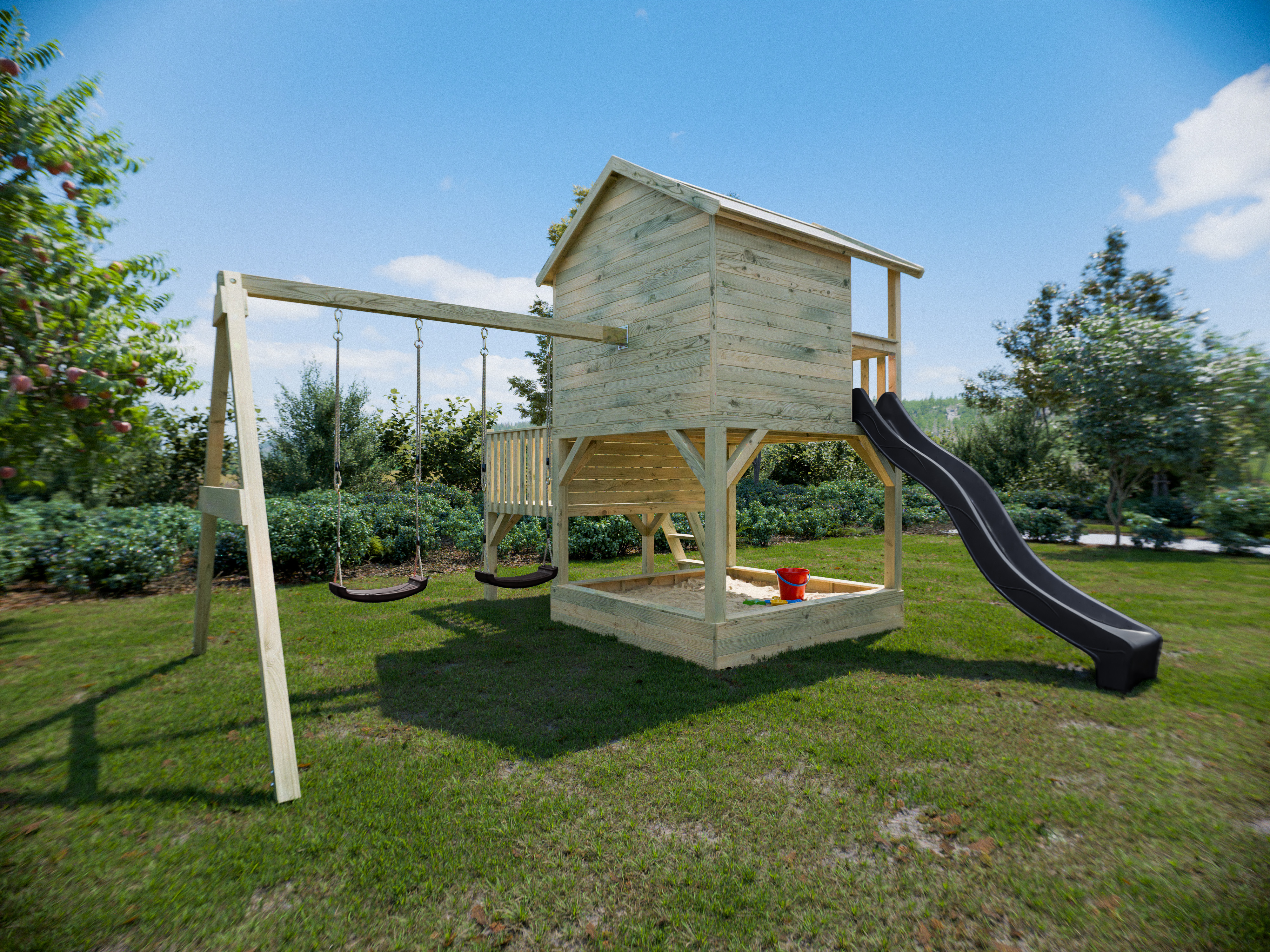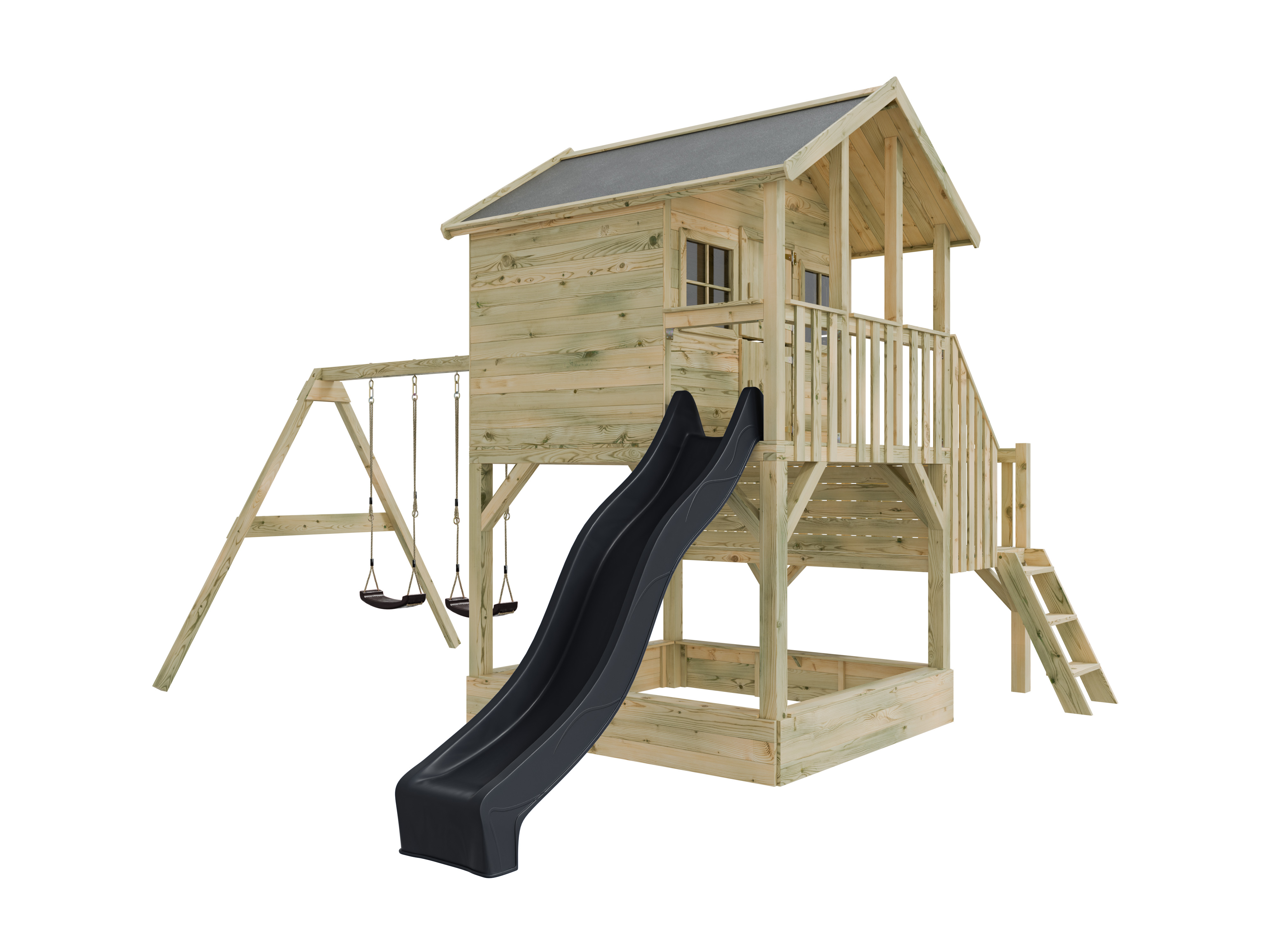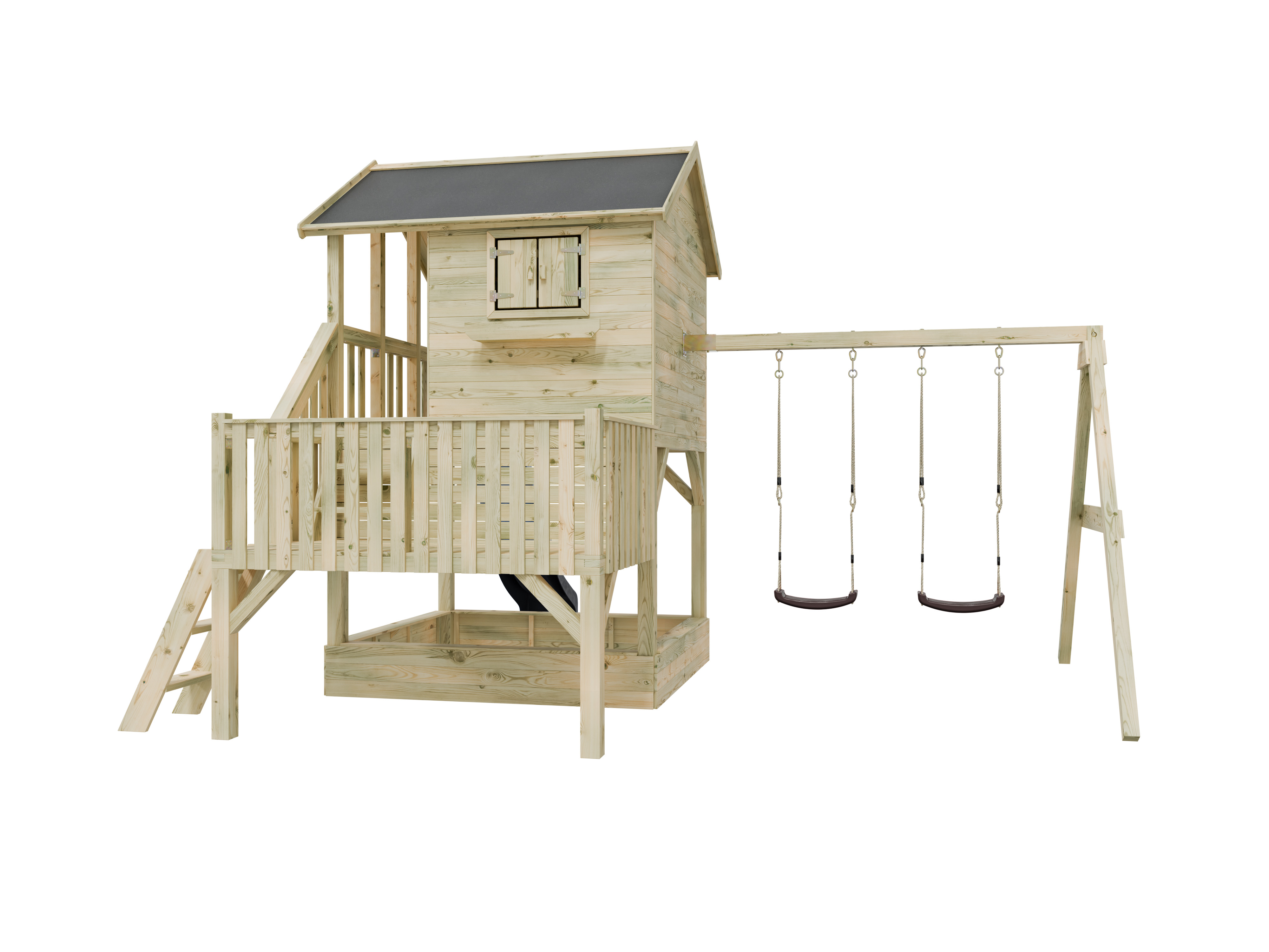 Das Stelzenhaus wird mit Doppelschaukelanbau (7 x 7 cm starke Pfosten, 9 x 9 cm starker Querbalken) inklusive zwei Schaukelsitzen geliefert. Bitte beachte, dass der Schaukelanbau nur wie abgebildet auf der Rückseite des Stelzenhauses montiert werden kann. An der Seitenwand mit offenem Fensterausschnitt ist dies aus Sicherheitsgründen nicht möglich. - Kesseldruckimprägnierung für lange Haltbarkeit