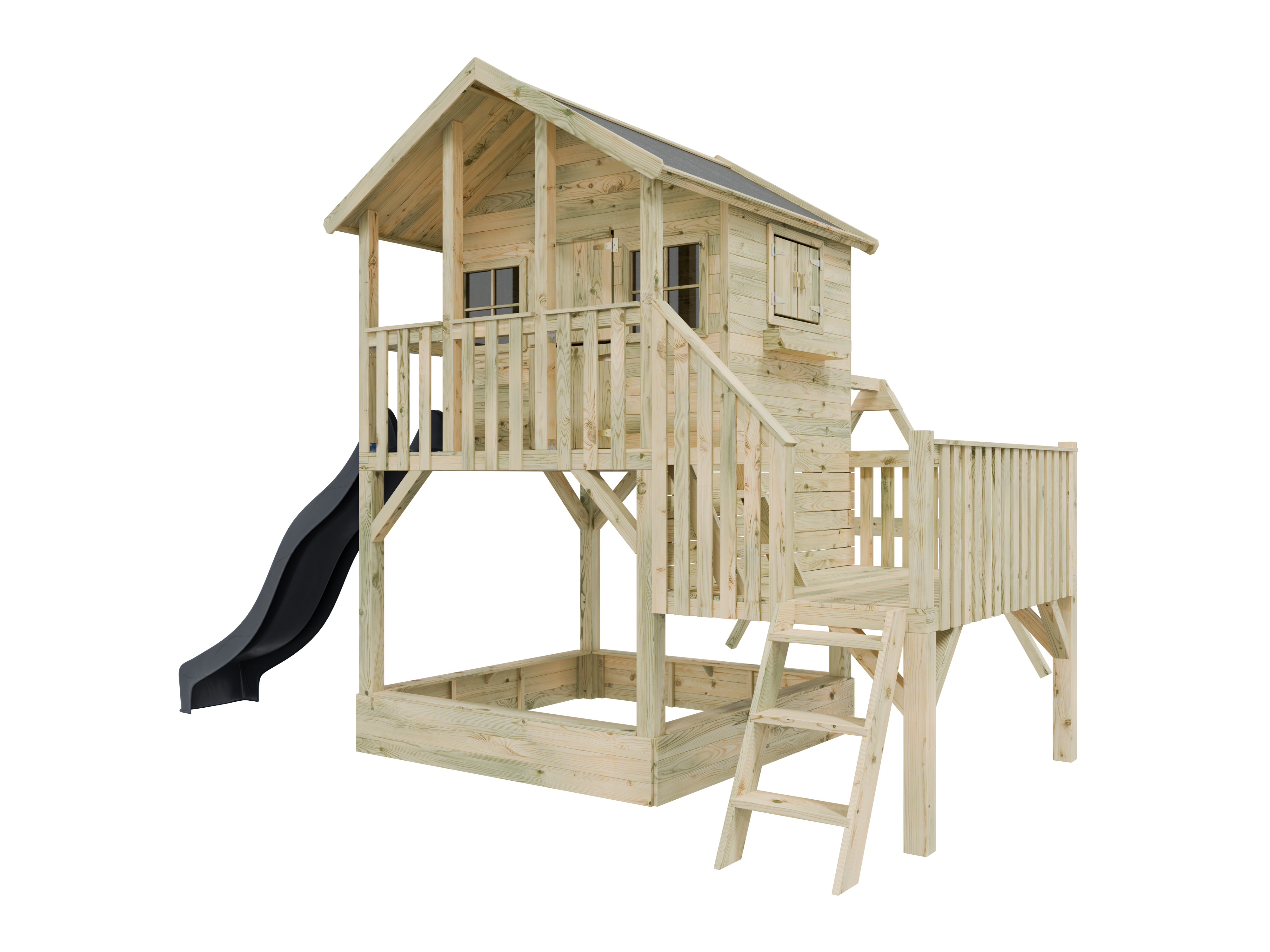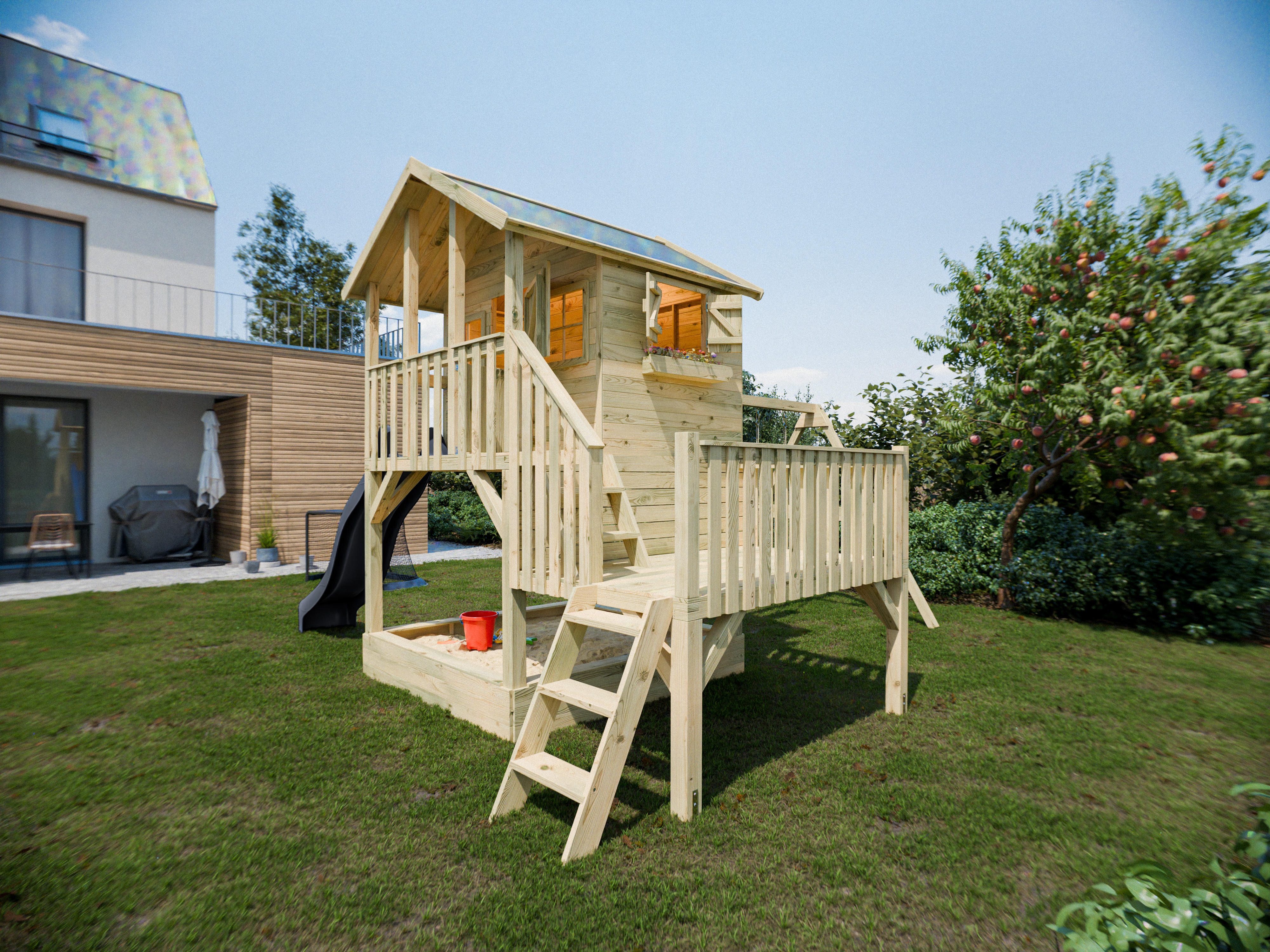 Das große Stelzenhaus mit großzügigem Seitenpodest lässt Kinderherzen höher schlagen.