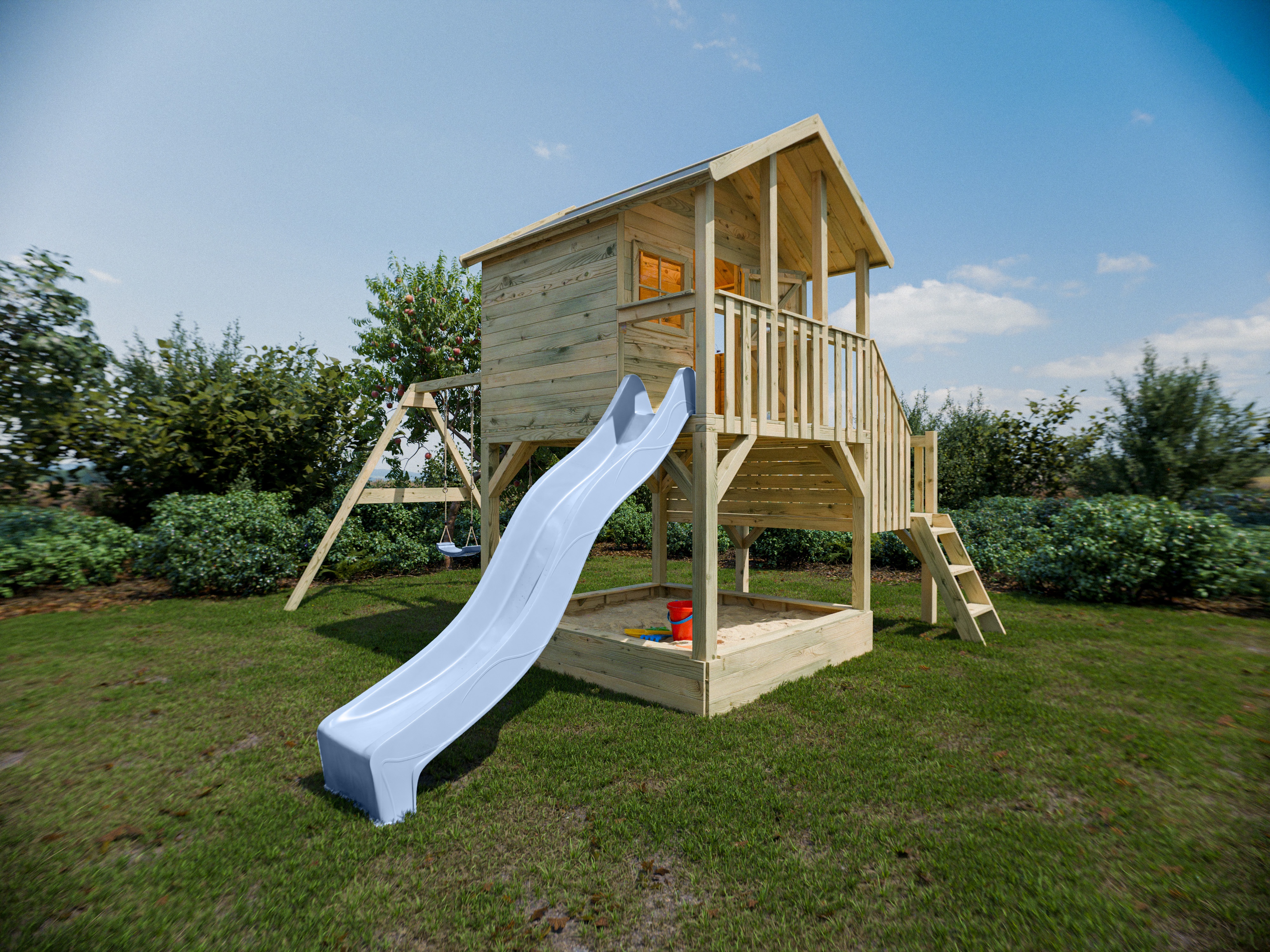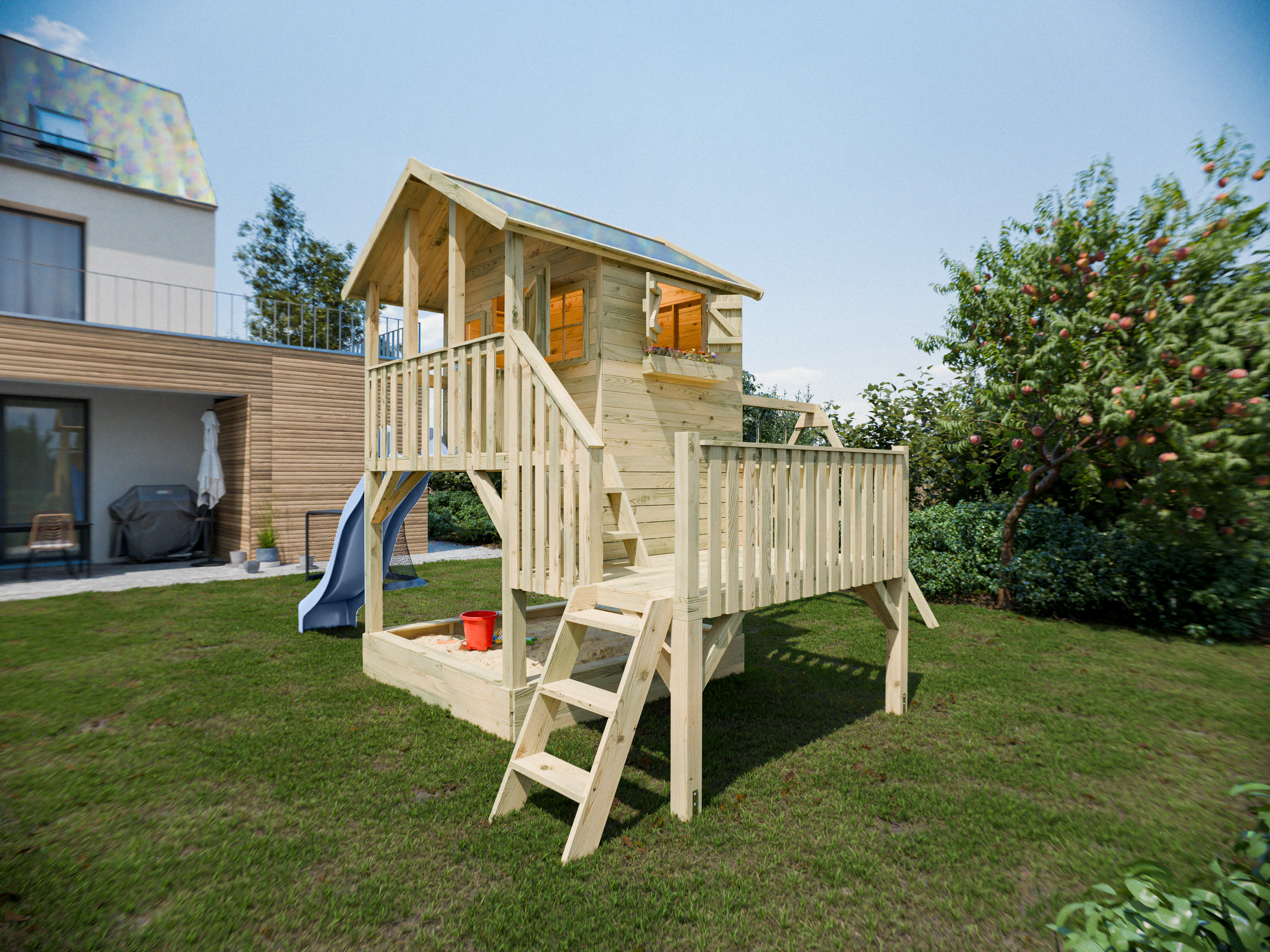 Das große Stelzenhaus mit großzügigem Seitenpodest lässt Kinderherzen höher schlagen.
